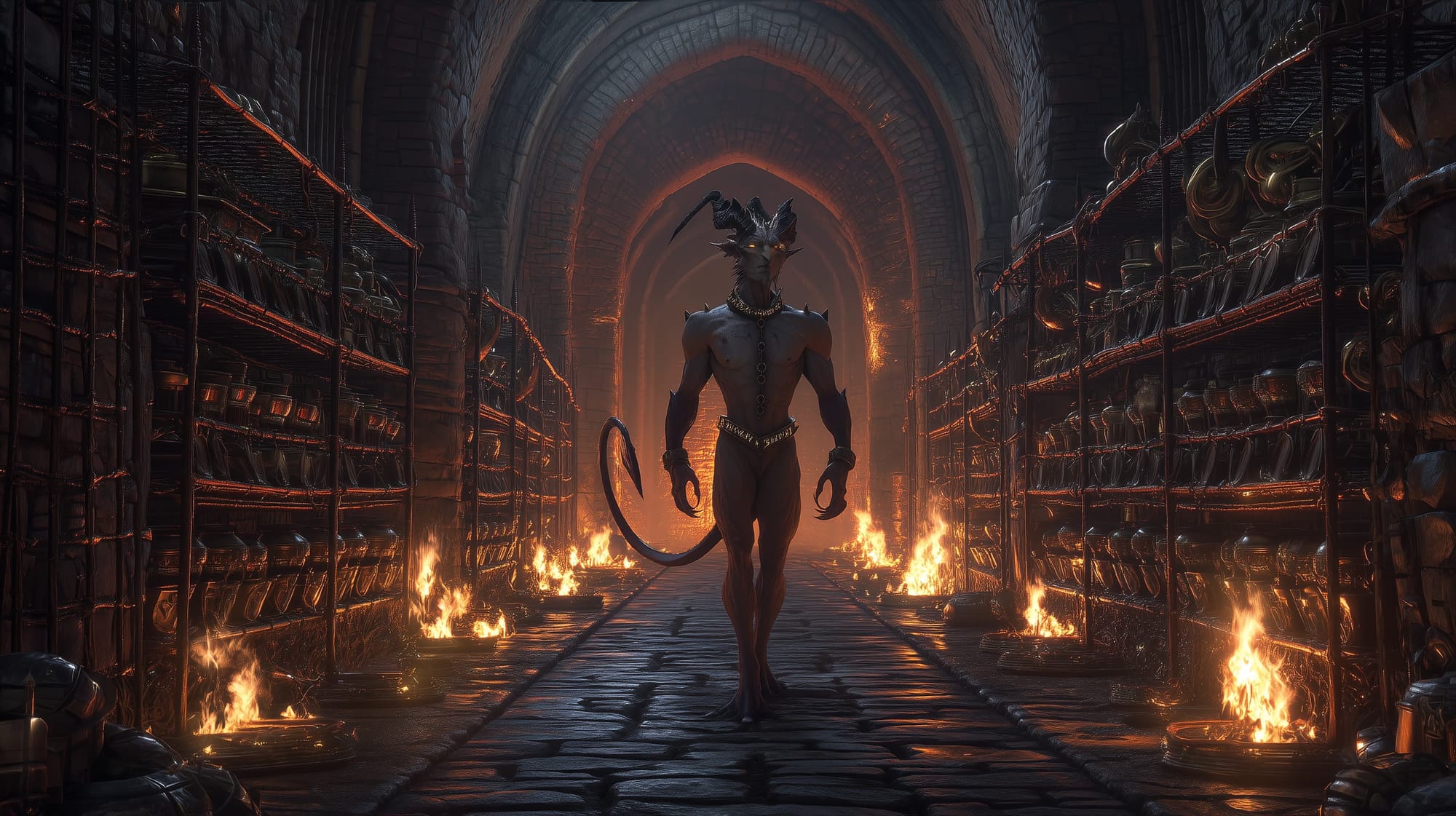 His horns curve sharply backward like broken blades, framing a face carved into a permanent expression of grim focus. Molten amber eyes glow beneath a heavy brow, burning with institutional certainty rather than fury. Scars crisscross his torso, each one ritualized rather than accidental.