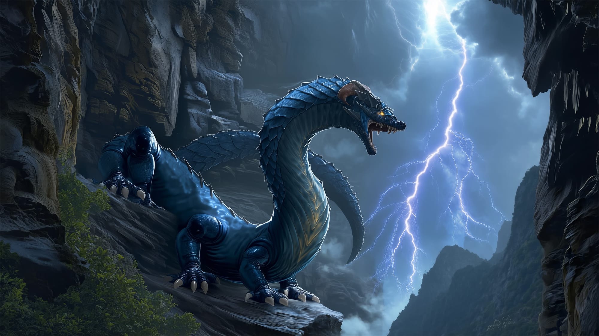 Korthyrax is a colossal, serpentine monstrosity, its elongated body supported by powerful, clawed limbs that anchor it to cliff faces and cavern walls. Its scales are a deep storm-blue, slick and reflective like rain-polished stone, each one faintly etched with lightning scars that pulse with inner light when it draws breath.