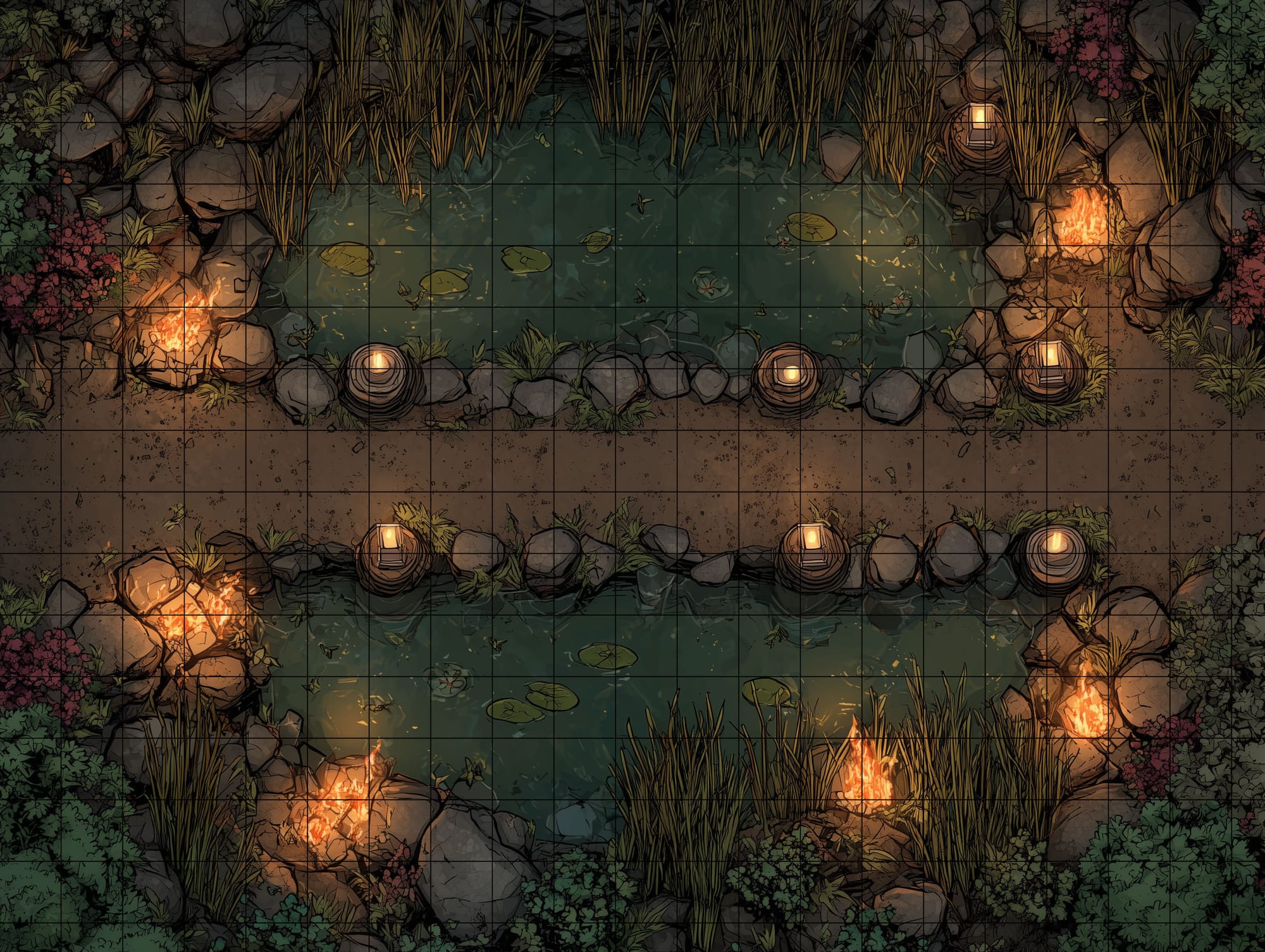 This map is perfect for encounters rooted in tension and atmosphere: ritual interruptions, solemn negotiations, ambushes during a procession, or a “safe crossing” that becomes anything but. The narrow path naturally creates a chokepoint, while the two pools on either side offer flanking routes for swimmers, lurkers, or creatures that can strike from reeds. Because light sources are placed deliberately and can drift or be extinguished, the battlefield can change dramatically round-to-round—ideal for DMs who want a fight to feel alive and cinematic.