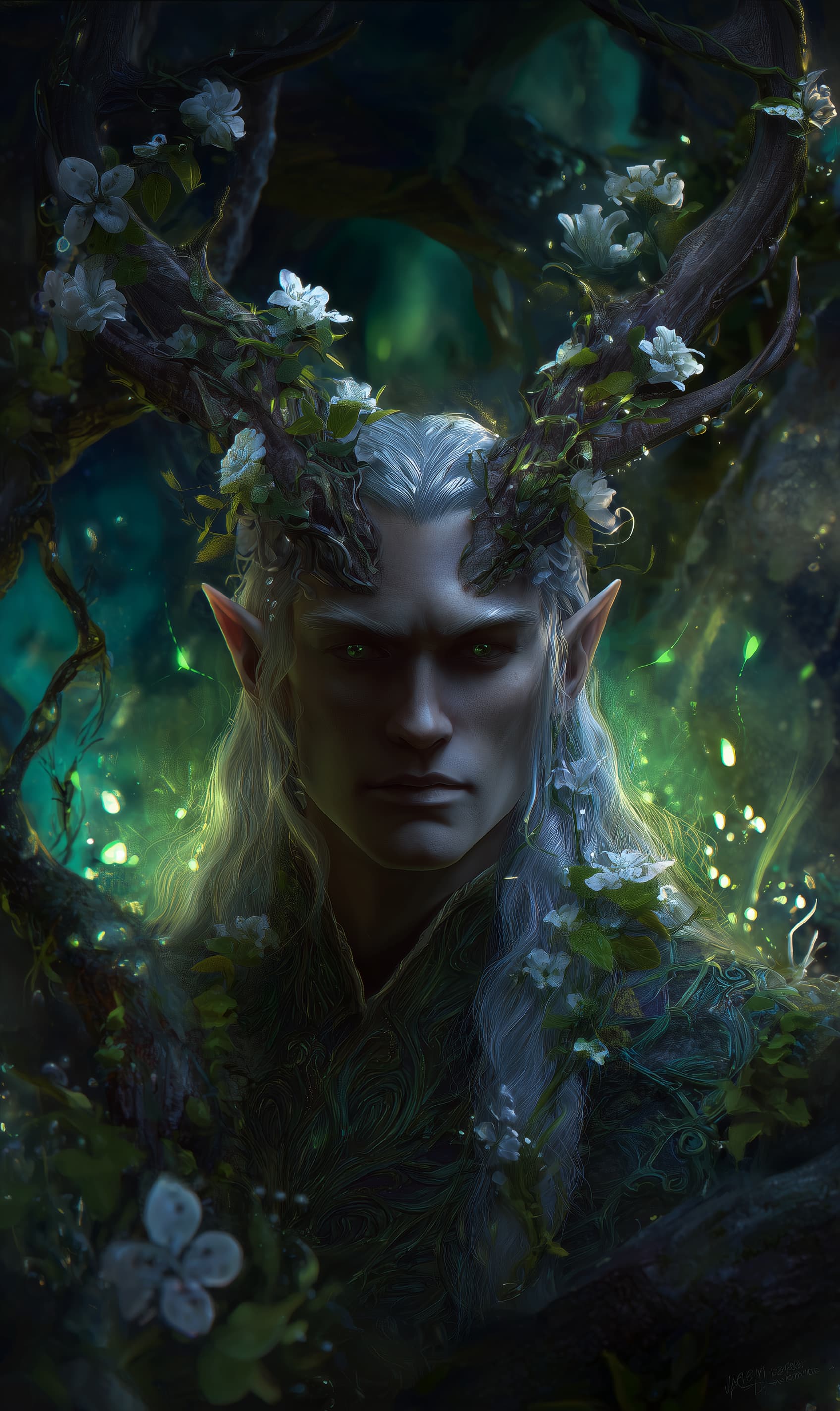 Appearance: Parithan is tall and willowy, his body composed of flesh entwined with living wood. Moss spreads across his shoulders like a royal mantle, and tiny blossoms bloom from his silver-threaded hair. His crown is a living rack of antlers from which vines sway gently regardless of wind. His robes are layered with green and bronze silk, laced with roots that shift subtly as he moves. His eyes are a deep bark-brown, ancient and impassive, like tree rings hiding centuries.