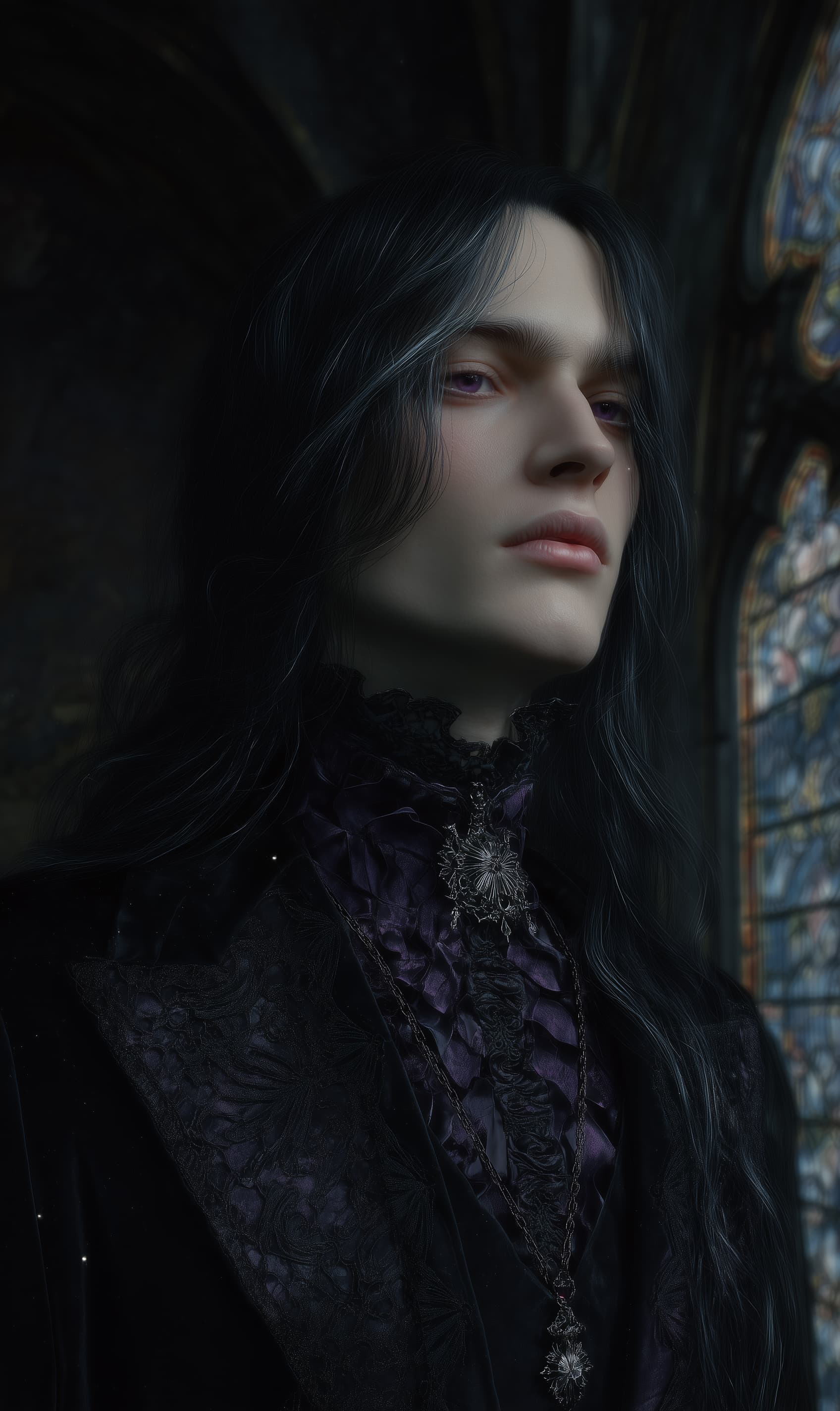 Appearance: Vencel is lean and elegant, his presence refined but unnerving. Pale skin contrasts with shoulder-length ink-black hair streaked with silver, and his dark violet eyes never blink quite when they should. He wears velvet and obsidian-threaded formalwear, tailored in Duskhaven’s finest style — always adorned with an antique mourning brooch. His voice is smooth, confident, and hollowed by secrets. A strange silver ring glows subtly when he speaks in languages long forgotten.