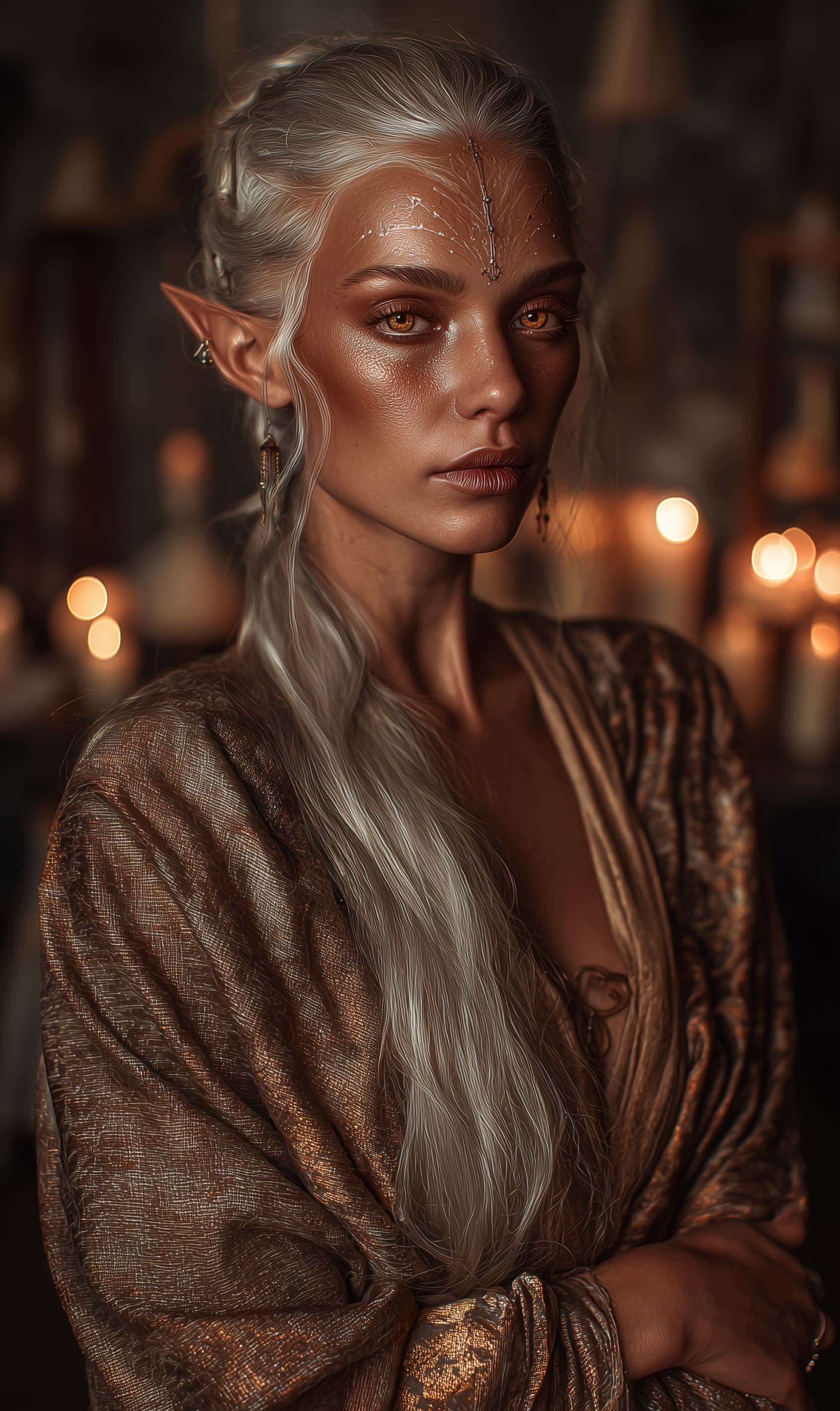 Appearance: Lunessa has golden-burnished skin, auburn eyes that flicker like candlelight, and long reddish-gold hair threaded with fine silver cords. Her voice is soft and hypnotic, layered like harmony. She wears a wrap-style coat of shifting fabrics—each piece sewn from different eras and cultures. Her fingers are long and delicate, with thimbles etched in protective runes. Her workshop smells of lavender, old parchment, and warm wool.