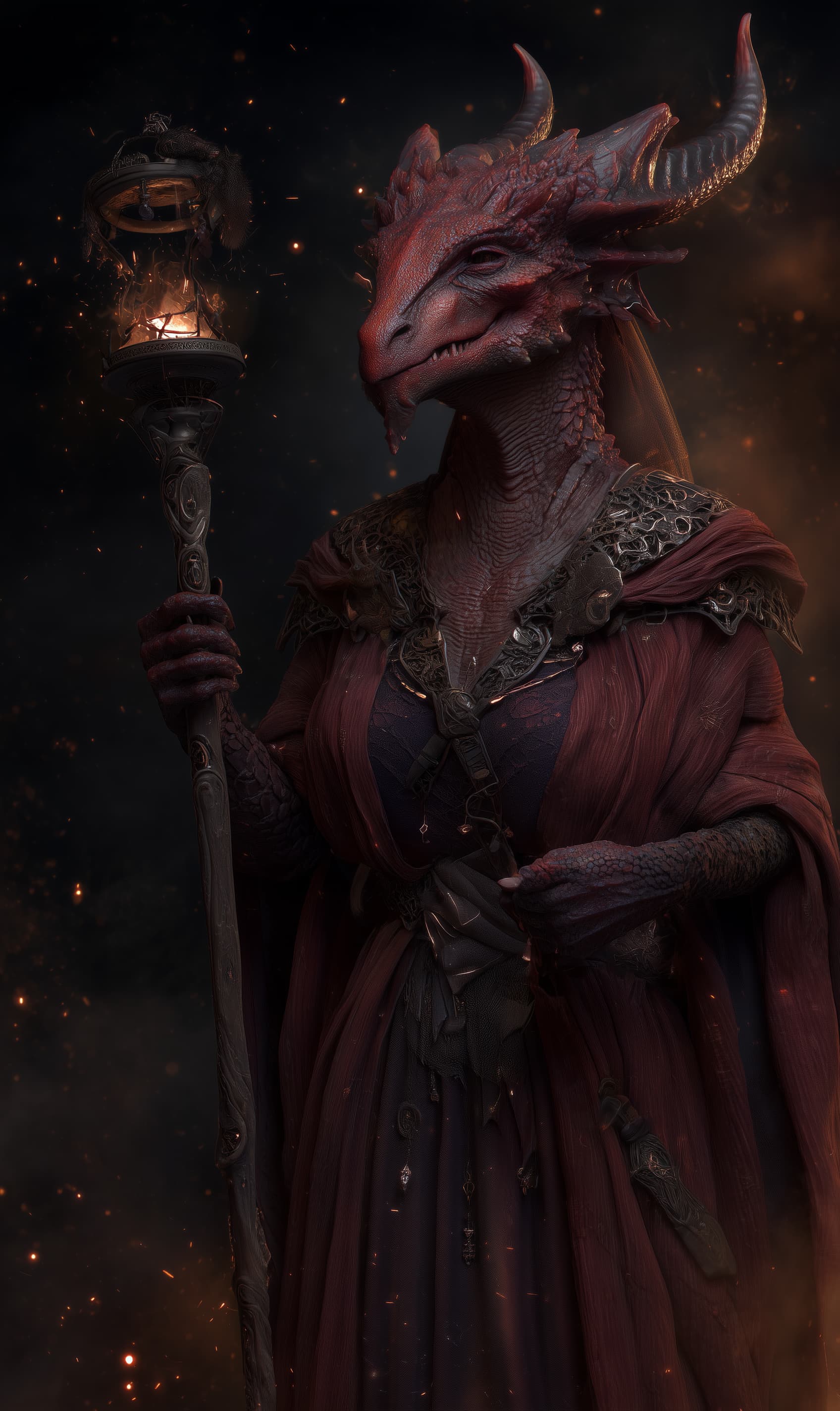 Appearance: Maedra stands tall and imposing, her crimson scales glinting like smoldering coals. Wide, blackened horns curve from her crown, their tips glowing faintly with embers. Her blind eyes are pale ash, and her nostrils emit curling wisps of smoke. She wears a flowing robe charred at the hem, layered with fire-wrought beads that jingle softly. In one clawed hand, she carries a staff topped with a constantly burning brazier, the coals inside shifting as if alive. Around her waist hangs pouches of emberstones and ash-forged scrolls.