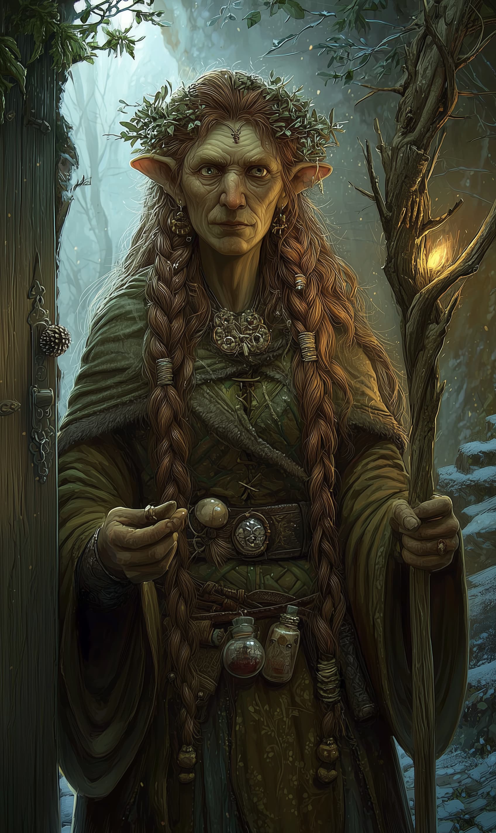 Appearance: Maela is tall and broad-shouldered with soft, moss-green skin and freckles like pine dust across her cheeks. Long auburn hair—threaded with birch bark charms and sprigs of dried heather—falls in a thick braid. Her eyes are cool hazel, attentive and kind. She wears layered seal-wool and bark-lined leathers stitched in practical patterns, a green felt shawl pinned with a pinecone brooch, and a belt crowded with corked vials, poultice tins, and folded muslin. Her hands carry the stains of tannins and sap; a gnarled quarterstaff—polished smooth at the grip—doubles as walking stick and herb-harvest pole.