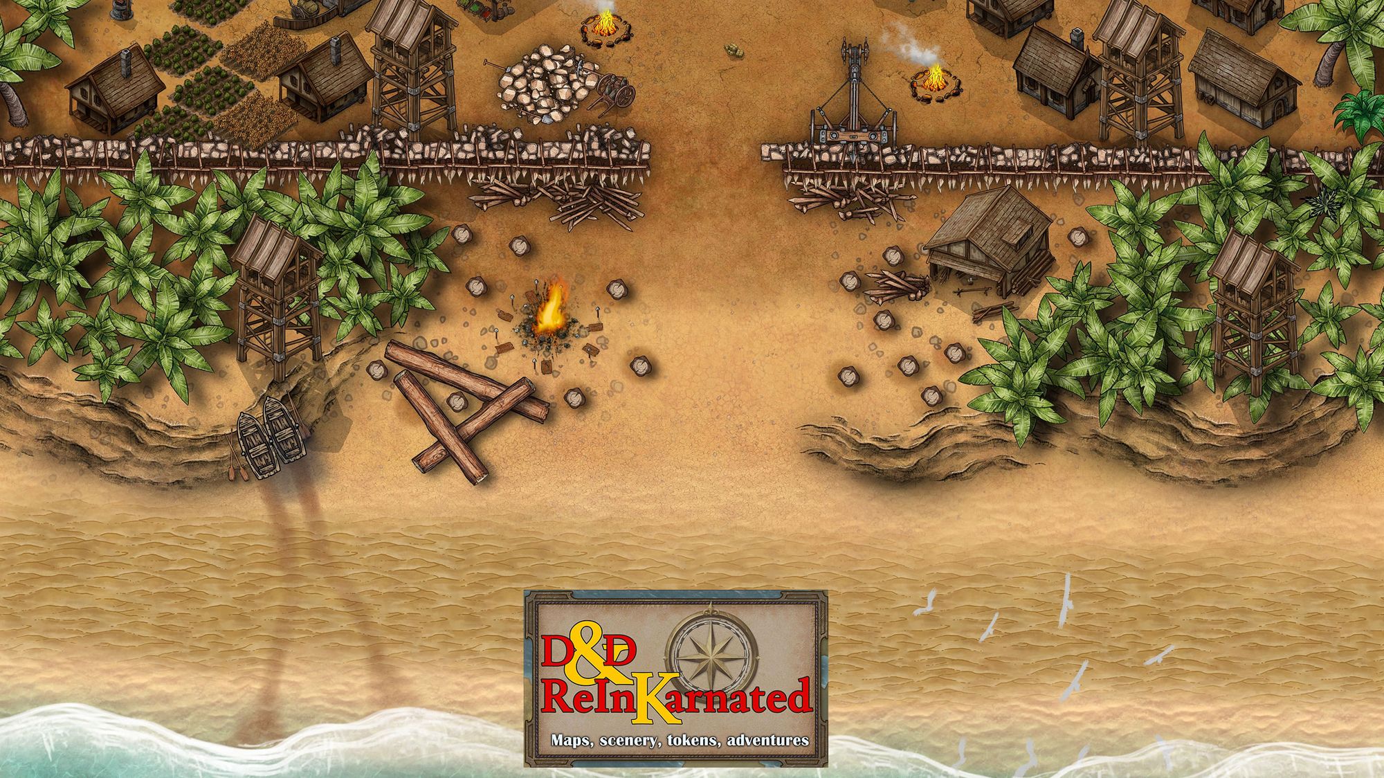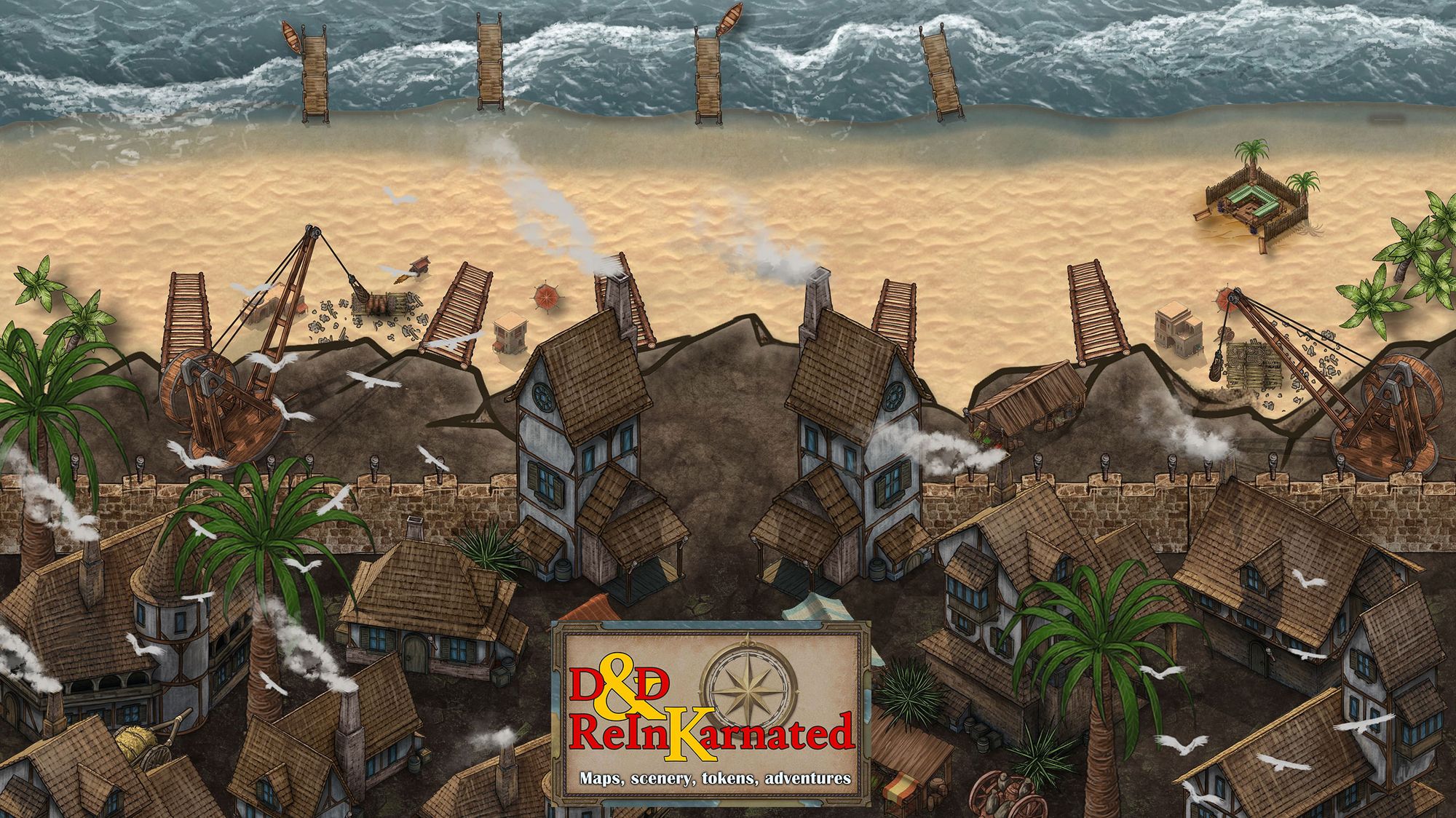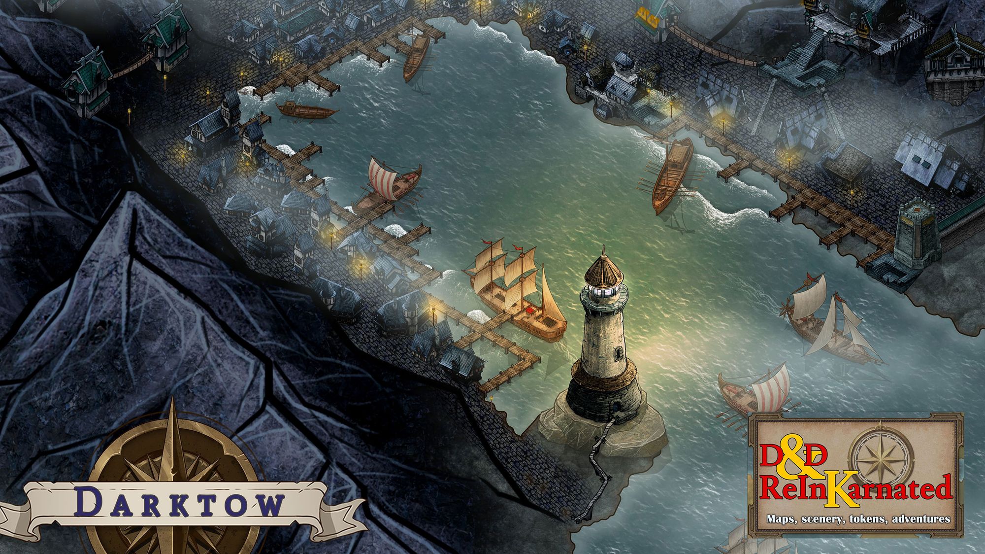 Darktow's many ramshackle structures sprawl across numerous rock shelves and caverns, connected by bridges, tunnels, and rickety platforms. A vast shipyard surrounds the southern cliffs with a winding network of docks and bridges, while other fortifications bristle with cannons. Other siege weapons dot the jagged edges of the isle.