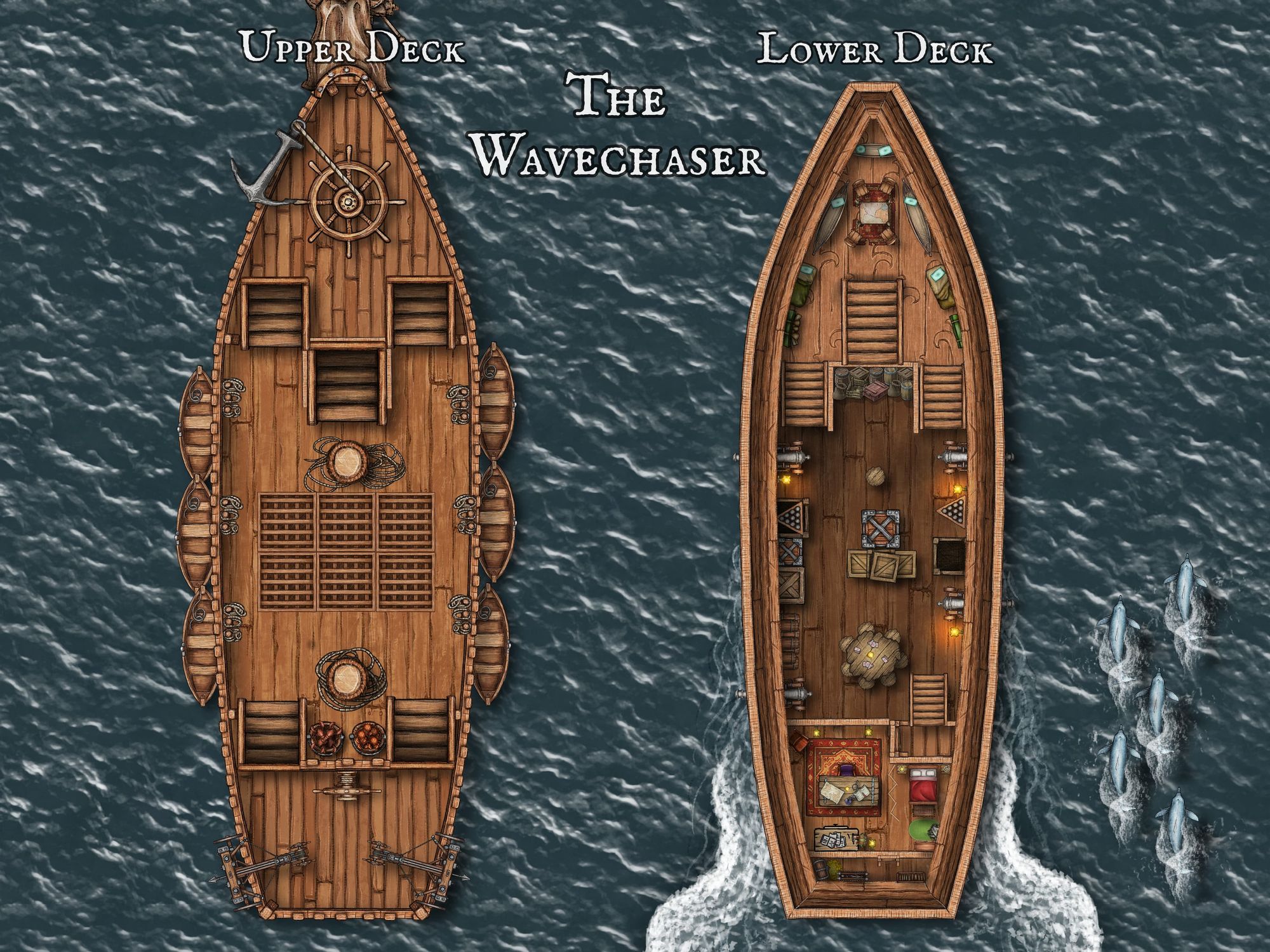 The crew of the Wavechaser are Captain Three Earrings, First Mate Heidi Axelbeard, Boerth, Dajarkal, Kiljori, and Dillyu
