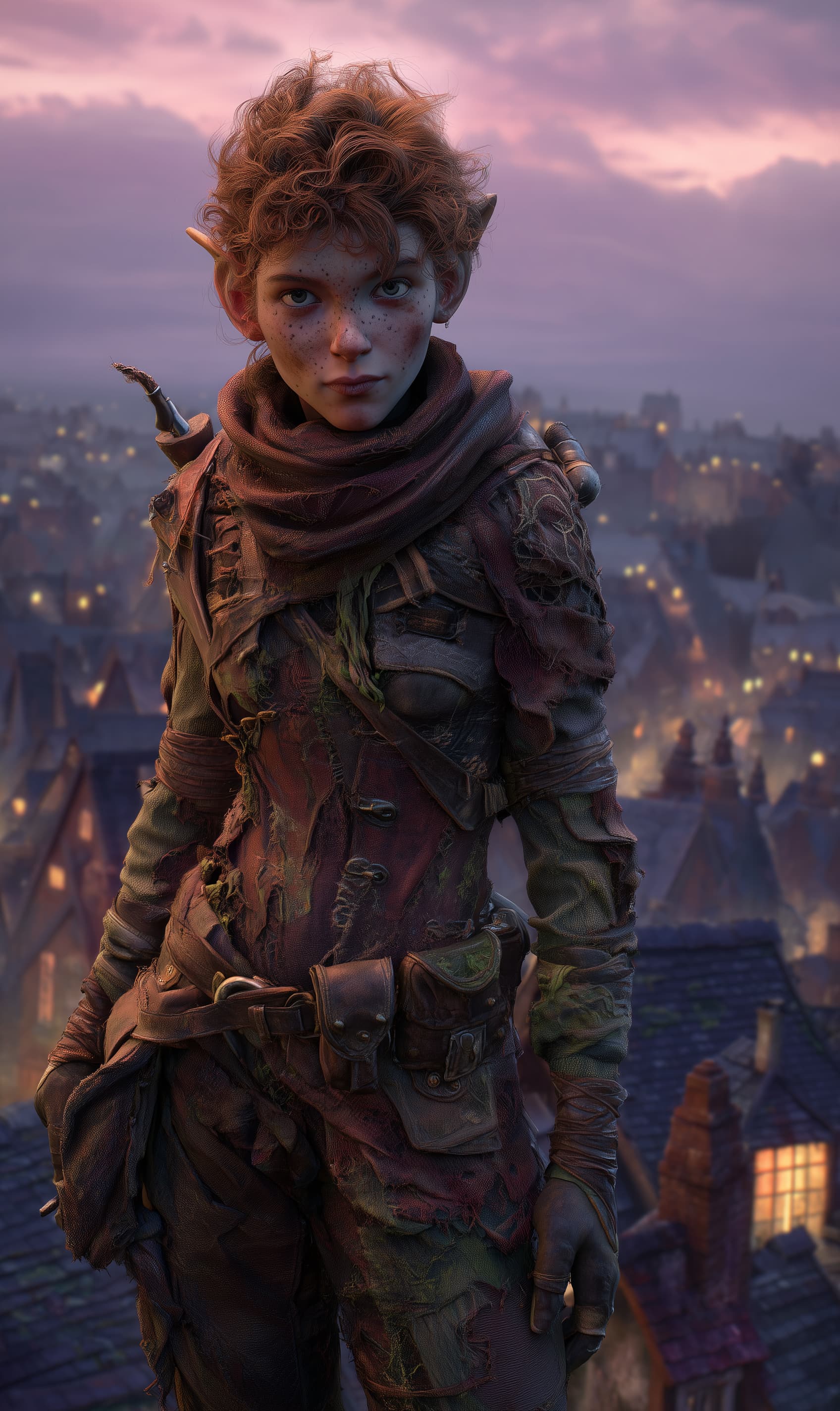 Appearance: Midge is a small, with a wiry frame and freckled face perpetually smudged with soot or flour dust. Her curly copper hair is cropped short and chaotic, often half-tied with twine or bent nails. She wears layered hand-me-downs, all with hidden pockets and subtle reinforcements — old armor scraps sewn into a scarf, a belt buckle that’s actually a keyring. Her bright hazel eyes are constantly darting, her grin crooked and knowing.