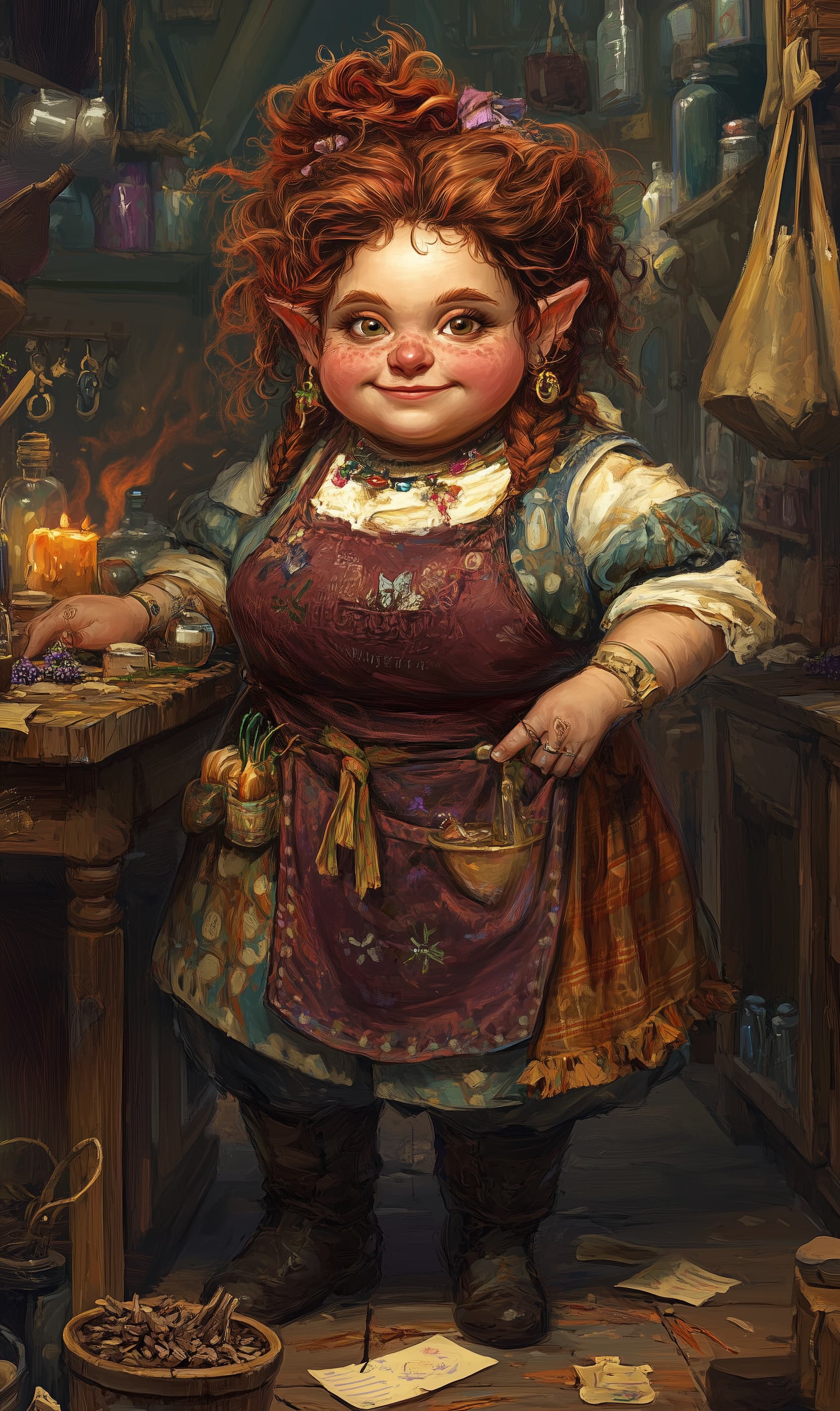 Appearance: Mira Hensley is a small, round-cheeked gnome with warm hazel eyes that gleam with curiosity. Her curly auburn hair is often tied up in a haphazard bun, with bits of wax and herbs tangled in the strands. She wears simple but colorful patchwork skirts and a sturdy apron stained with the melted remnants of countless candles.