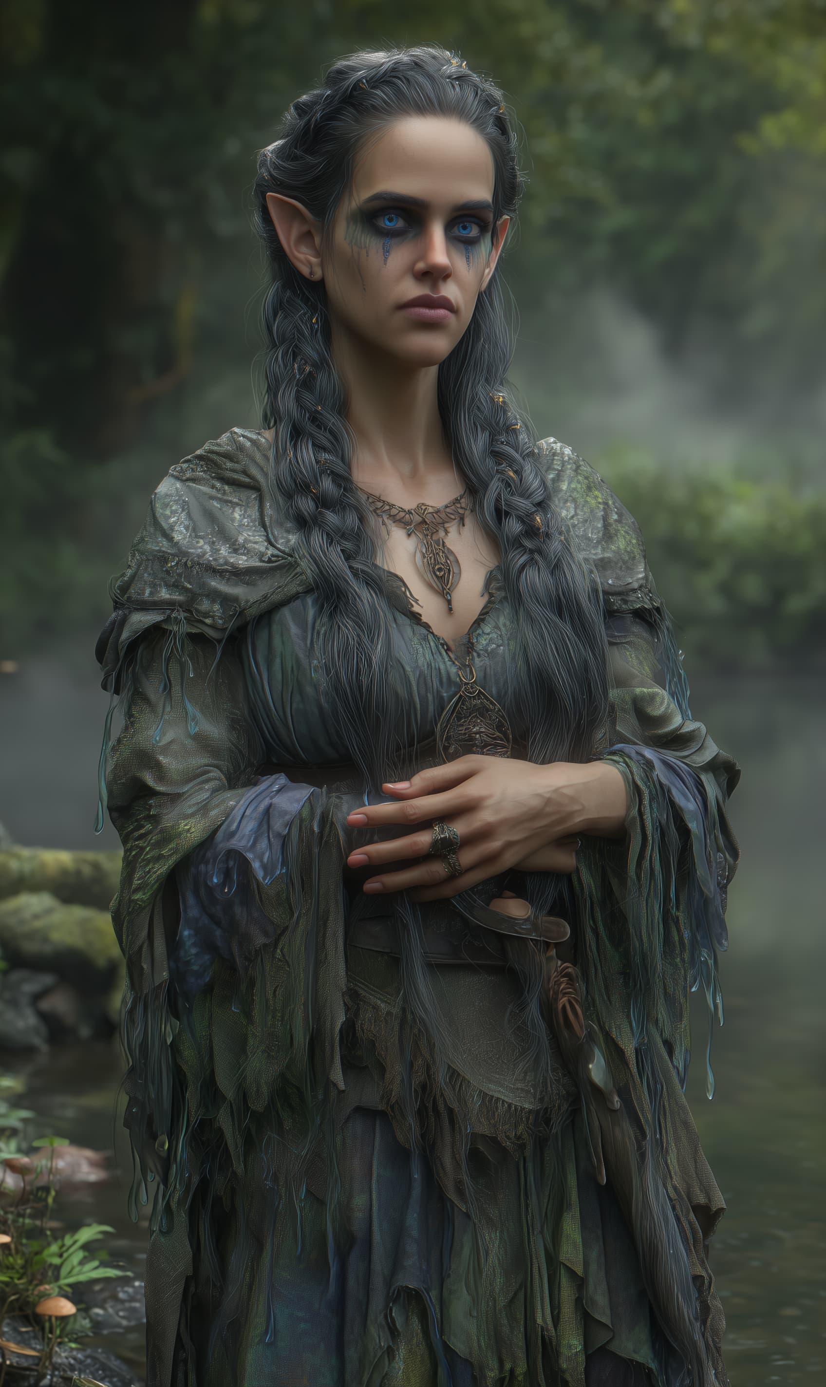 Appearance: Mira Saltwillow is a slender half-elf woman with smooth olive-toned skin and long, dark hair braided with thin strands of sea grass, shells, and river pearls. Her ears taper gently, marking her mixed heritage without exaggeration. Her eyes are a striking pale blue-gray, like shallow water under clouded skies, and often appear distant—as if watching something far beyond the present moment.