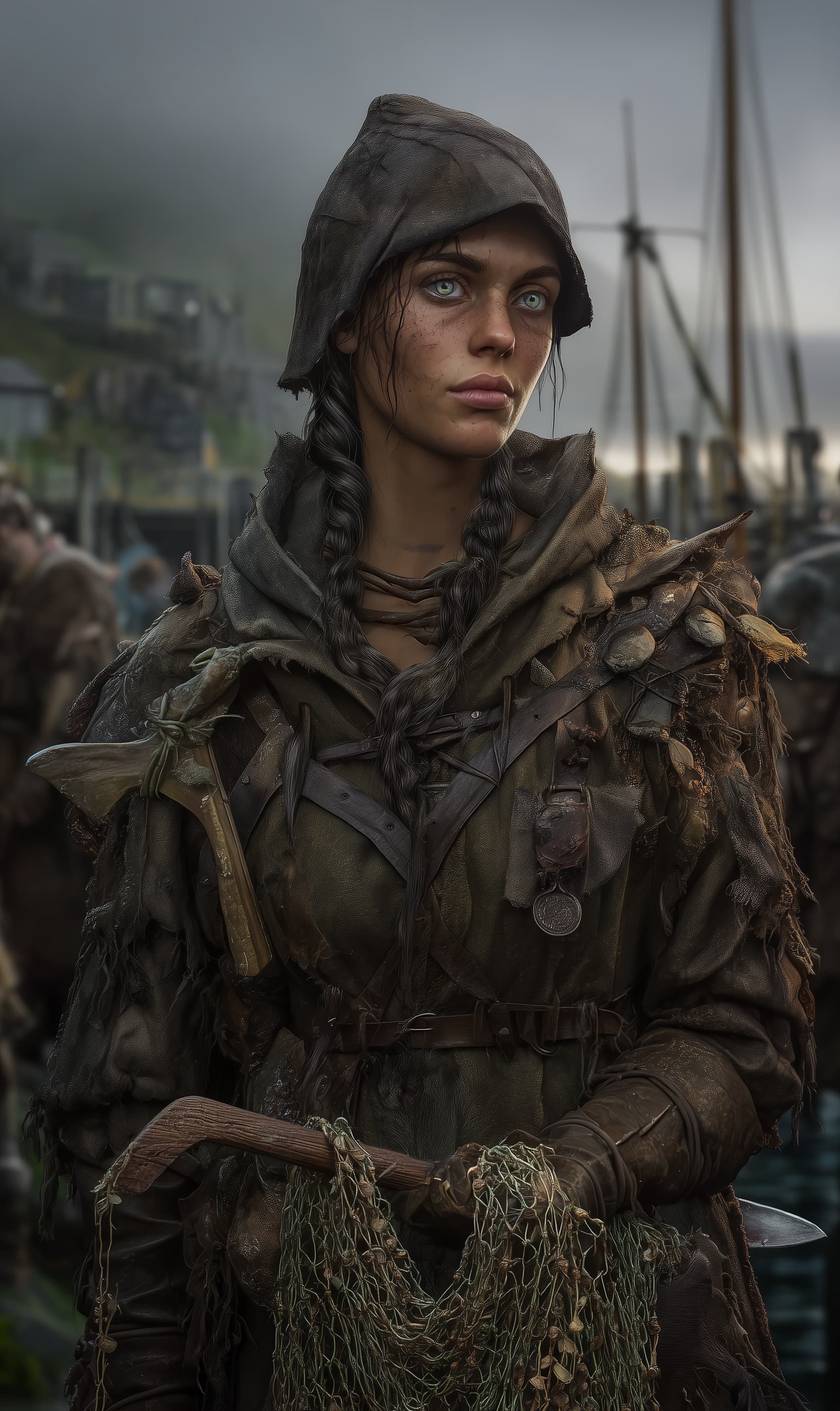 She dresses in practical layers: a patched sea-cloak, a thick knit sweater, and trousers bound at the calf for wading. A net-mender’s kit hangs at her hip—needles, twine, small bone shuttles, and a hook knife. Her boots are scuffed and seaworn, and her belt holds a small pouch of smooth stones used as sink weights. Around her neck is a quiet charm: a strip of kelp-dyed cord tied in a fisher’s knot, worn tight like a promise.