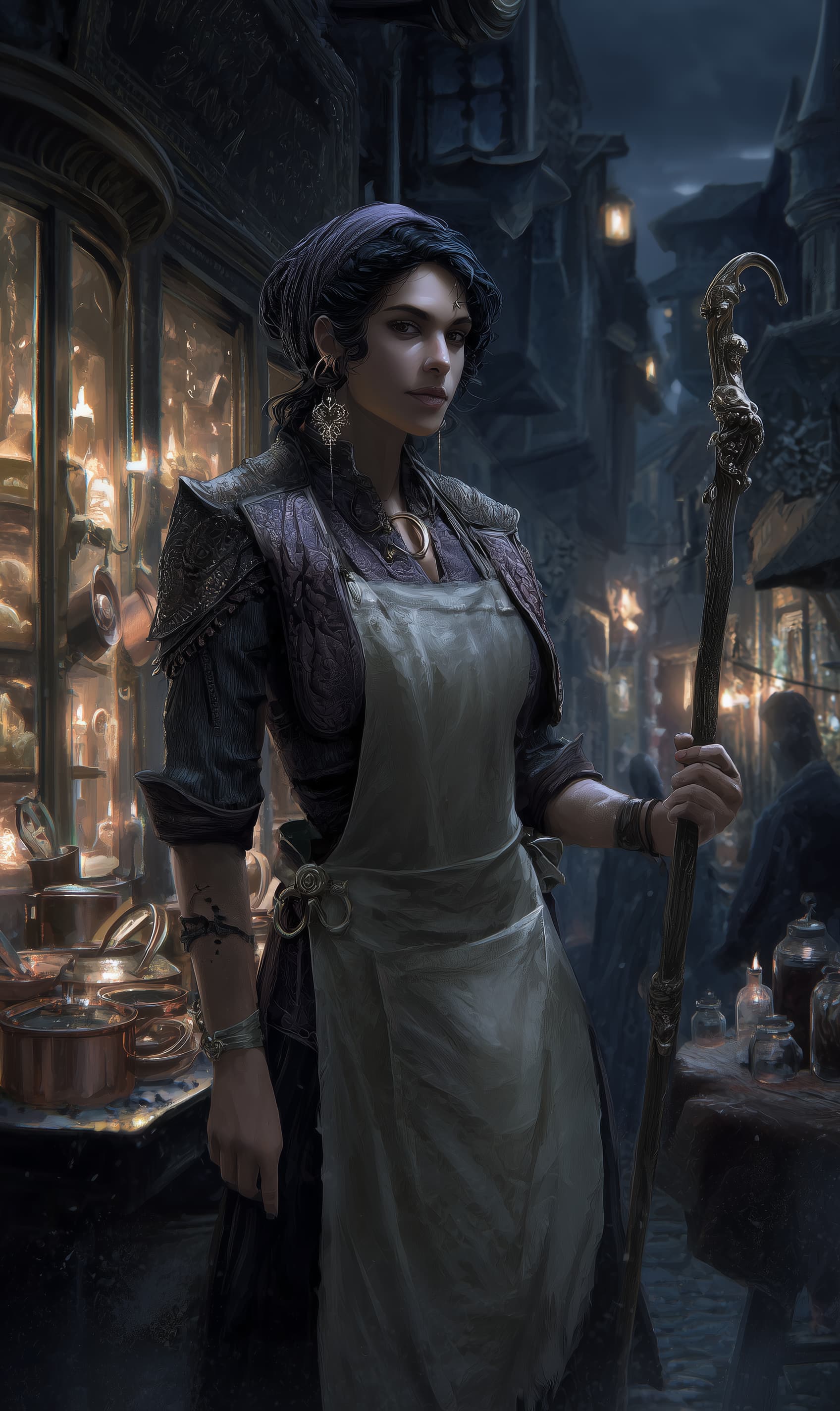 Appearance: Vell is a striking woman in her late thirties with severe cheekbones softened by a perpetual sugar-dust sheen. Ink-black hair is wrapped in a headscarf the color of candied citrus, and a half-apron of waxed linen bears a stitched moth sigil. Her fingers are burn-scarred and deft; she wears a chatelaine of tasting spoons and sugar thermometers, and she carries a hooked confectioner’s cane that doubles as a window-shutter lifter in the shop.
