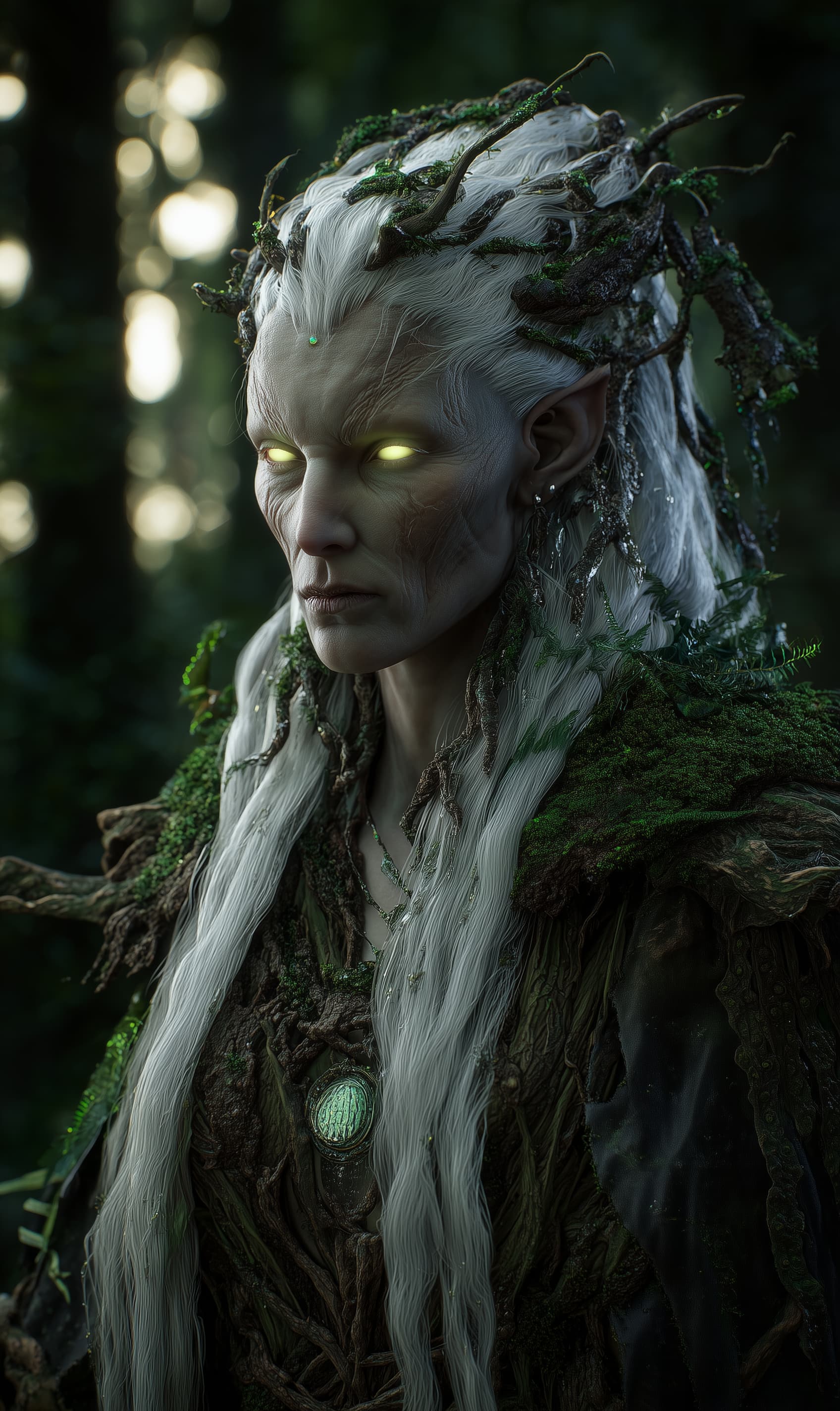 Appearance: Mother Umbrisa is tall for a drow, her frame wrapped in flowing robes of moss, spider silk, and living bark. Pale white hair flows down her back, woven with thorny vines and tiny glowing mushrooms. Her eyes are a murky gold-green, unfocused as if always watching something far beyond the present. Her voice is calm, whisper-soft, and echoes unnaturally when she speaks within her grove. A pulsing, rootlike scar spirals down her neck—an outward sign of her bond with something buried beneath Nightshade Thicket.