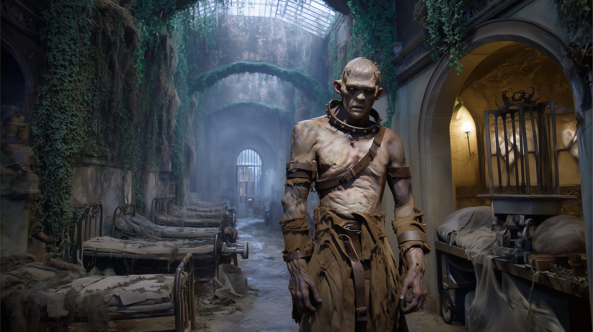 Mournskin stands nearly eight feet tall, sinewy and malformed, with stretched pallid flesh barely holding together at the seams. Rusted buckles and worn leather straps still bind him—once meant to restrain, now ritual scars. Strange arcane stitches crisscross his body, some forming runes, others names. His jaundiced eyes glow faintly gold, the last remnants of the many souls trapped within him. His jaw unhinges wider than it should when enraged—an anatomical impossibility born of necromantic flaws.