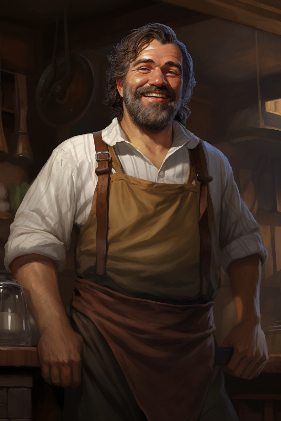 Appearance: Myles is a middle-aged man with a robust, barrel-chested build that speaks of years spent hauling barrels and tending to a busy tavern. His curly, peppered hair gives him a distinguished but approachable air, and his neatly trimmed beard frames a perpetual smile. His friendly brown eyes twinkle with humor and warmth, often putting even the most nervous traveler at ease.