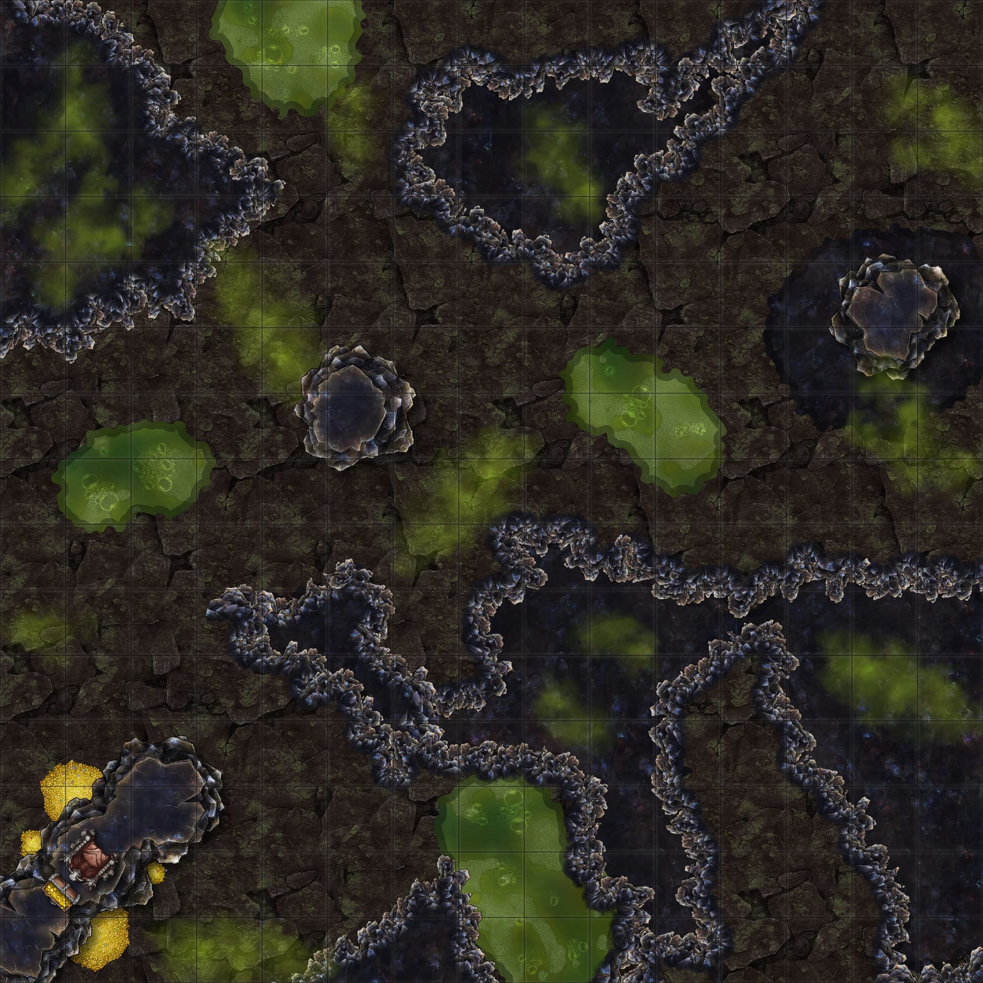 The Noxious Cavern is also well-suited for exploration-based gameplay. Players might be searching for stolen riches, looking to eliminate a dangerous foe, or seeking information from the cavern’s ruler. The twisted, toxic nature of the terrain makes navigating the space a challenge, and the throne hints at potential political intrigue. Is the ruler a tyrant to be overthrown, or an ally whose demands must be met?