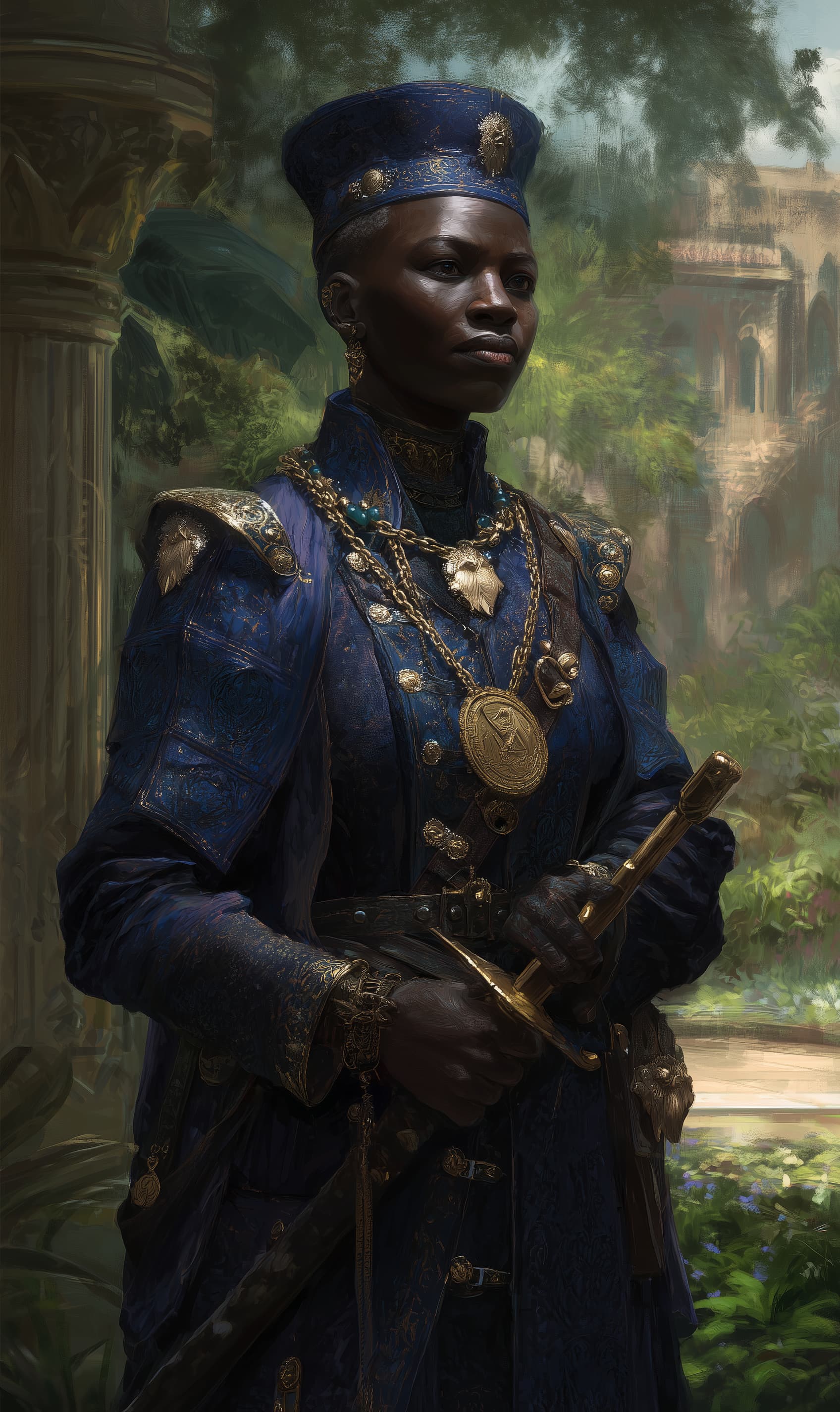 Appearance: Nyla Ashford is thirty-seven and looks every year of it in the best possible sense β a composed, handsome woman with a strong jaw, dark brown skin, and close-cropped natural hair kept immaculate beneath a ceremonial herald's cap of deep blue and gold when she's working, which is most of the time. Her voice is her most distinctive feature: a rich, clear contralto that carries across a crowded square without effort and can fill a throne room without a trace of strain. She wears the royal herald's formal livery β deep blue tabard over a gold-collared shirt, polished brass buttons, and a long ceremonial chain bearing the Crown's speaking-seal β but keeps a practical riding coat belted at her waist for travel. A short baton of turned ebony serves as her speaking staff in formal settings; a small notebook with a battered cover and very precise handwriting lives in her left breast pocket.