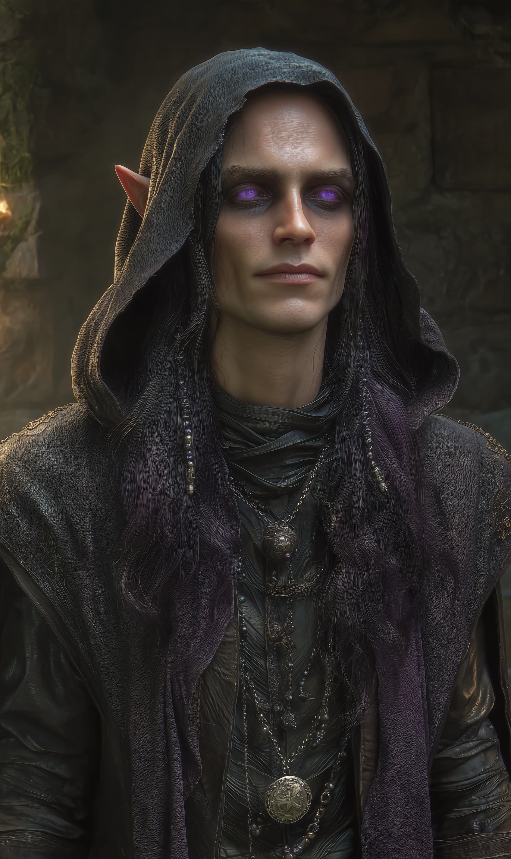Appearance: Nyriel Shadeleat carries the solemn stillness of a mausoleum lantern. Slightly taller than the average human, with the lean grace of their elven heritage, they move with measured, deliberate steps that never seem to startle the quiet around them. Their skin is a cool, pale ash tone with a faint pearly sheen, as if moonlight has soaked into it. Long, straight hair the color of dark wine falls to mid-back; some days it’s braided close, other days loose and wind-tousled, adorned with simple bone and silver beads. Their features are androgynous—sharp cheekbones, straight nose, full mouth—with eyes like clouded amethyst that catch the glimmer of any nearby spirit-light.