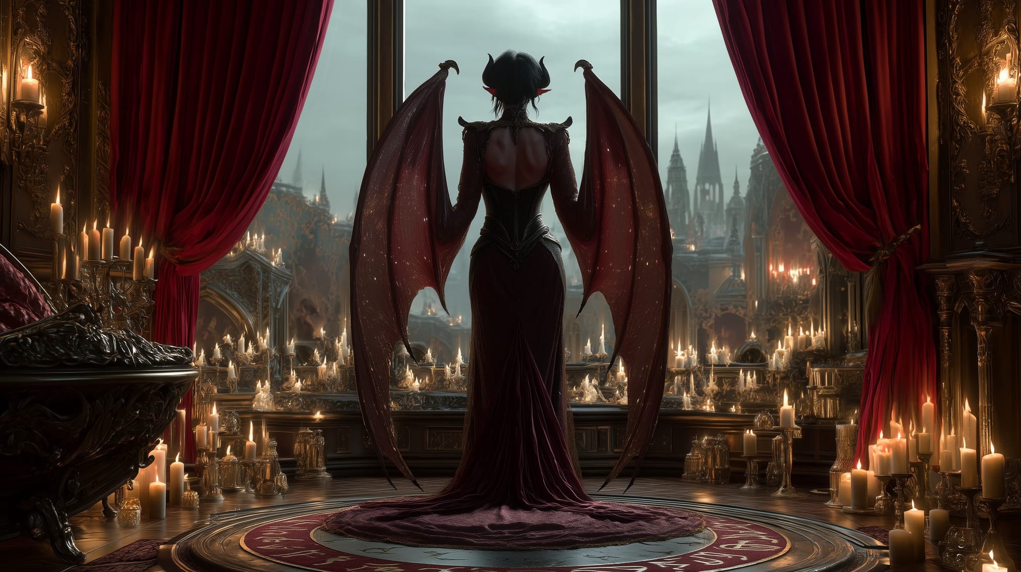 Nyssara wears a mortal guise most often—tall, alluring, and disarmingly graceful, with obsidian hair, crimson lips, and eyes that mirror the viewer’s desire. Her infernal form is seldom seen, but when revealed, she sprouts leathery wings veined with silver fire, and her skin darkens to an iridescent amaranth hue. Her tail ends in a quill-like barb, capable of both caress and curse.