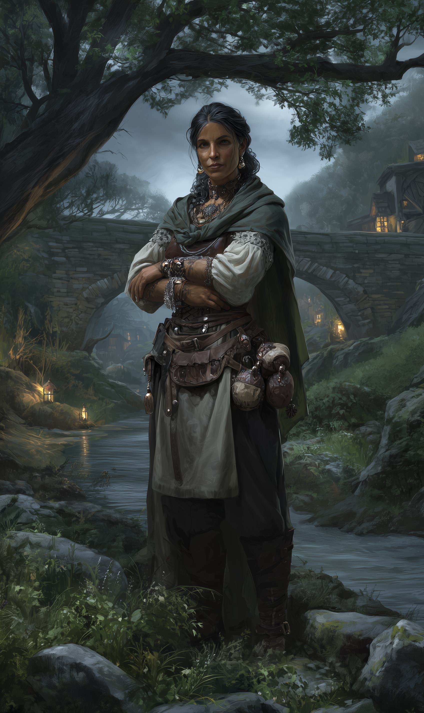 Appearance: Odelia is a sturdy woman in her early forties with wind-pinked cheeks, quick hands, and a calm, purposeful gaze. Black hair threaded with early silver is coiled beneath a linen wrap. She wears a river-green shawl over a practical apron crowded with neatly rolled ribbon-belts, bone buttons, and thread. A leather satchel carries clean cloths, tinctures, and a small bell. Around her wrist is a breath-count string—a long, knotted cord she slips between fingers as she works.