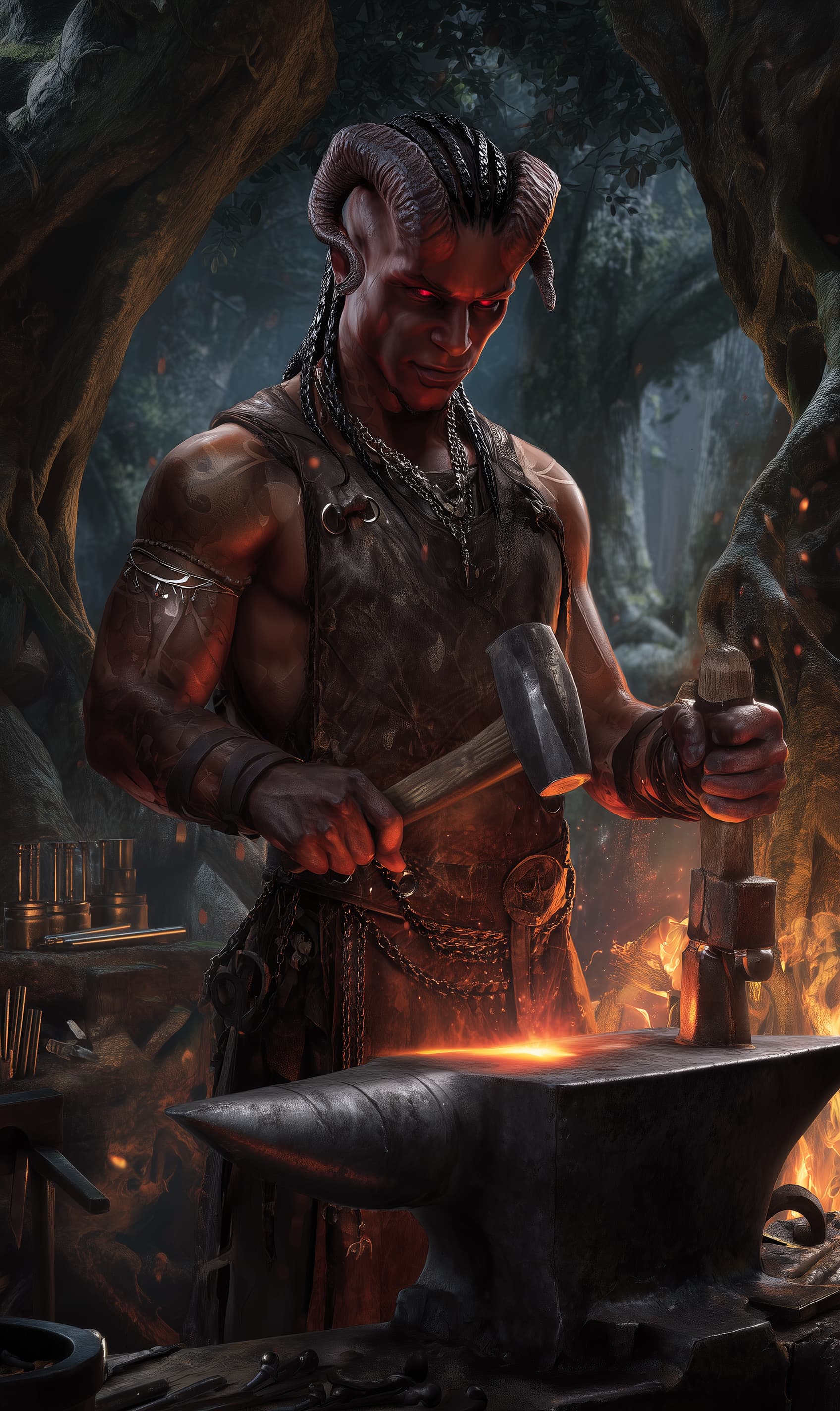 Appearance: Orlen is tall and broad-shouldered with ember-toned skin, thick forearms, and glowing eyes like molten steel. His black hair is tied in a low braid, always dusted with ash. Two small, ridged horns curl back from his forehead, wrapped with silver thread. He wears a sleeveless forge apron, reinforced gloves, and a neck-guard shaped like stylized dragon jaws. His voice is low and gravelly, with a strange kindness behind it.