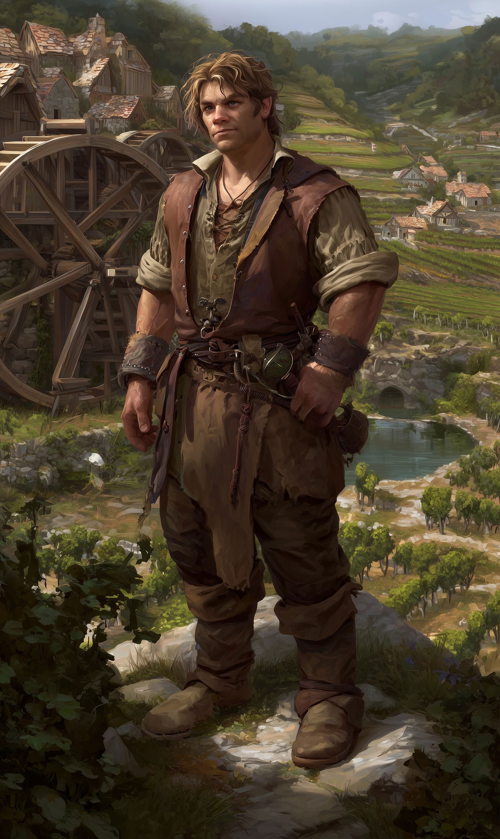 Appearance: Petyr is broad-shouldered and river-strong, with sun-browned skin, crow’s-feet, and a missing ring finger on his left hand (cleanly cut long ago). He wears a russet waistcoat and rolled shirtsleeves under a leather apron, a wooden stopper tucked behind one ear and a length of hemp cord coiled at his belt. A copper band—his late mother’s—sits on a cord around his neck. His hands always smell faintly of apple tannin, oak, and smoke.