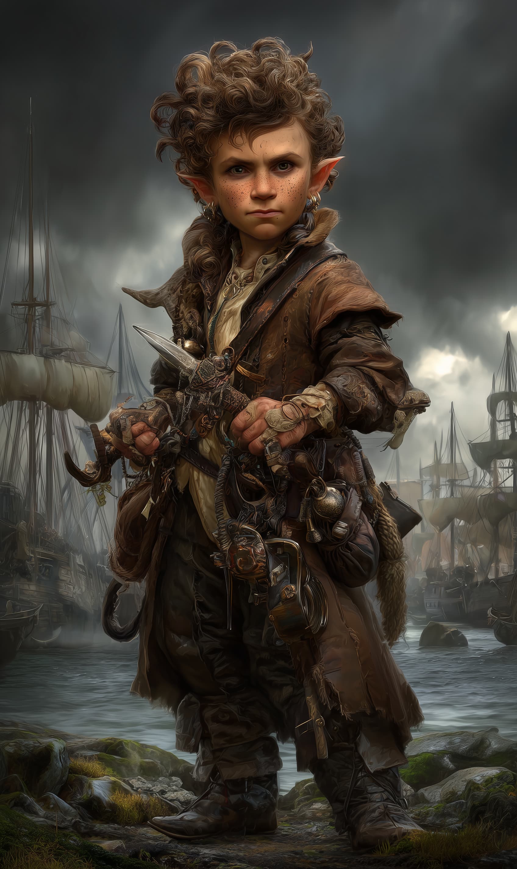 Appearance: Piper Gearwake is a compact gnome with a wiry, rope-trained build and a permanent salt squint, like she’s spent her whole life staring into glare off wet stone. Her copper-brown curls are shoved back with a strip of sailcloth, and her freckled face is peppered with tiny soot marks and windburn. One ear bears a small notch missing from an old hook accident, and she wears it with the quiet pride of someone who survived her own learning curve.