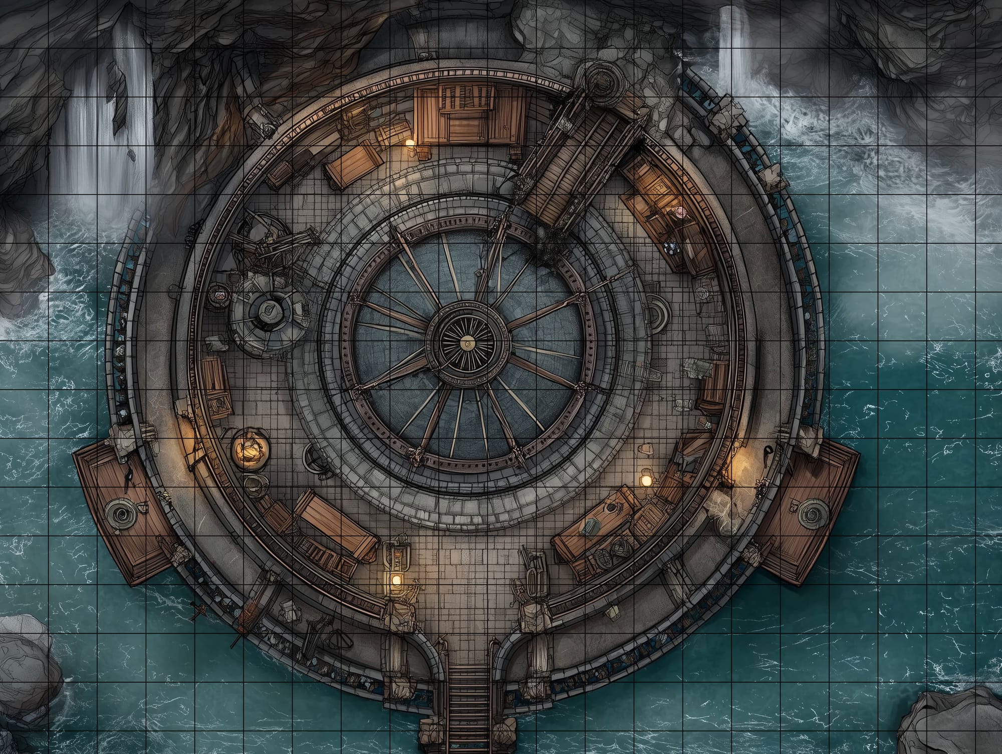 At the tower’s heart, a massive central lens chamber dominates the map: a radial, wheel-like prism assembly set within concentric stone rings, as if the beacon itself is a machine too important to be left to chance. Catwalk segments, angled stairs, and service platforms give multiple routes around the chamber, while small dock platforms jut from the tower’s sides for deliveries, repairs, or desperate escapes. Everything about the space feels engineered for a single purpose—control the light, command the coast—and in a fight, that purpose becomes a weapon: tight circular lanes, clear sightlines, and an ever-present edge where the sea waits to claim the unwary.