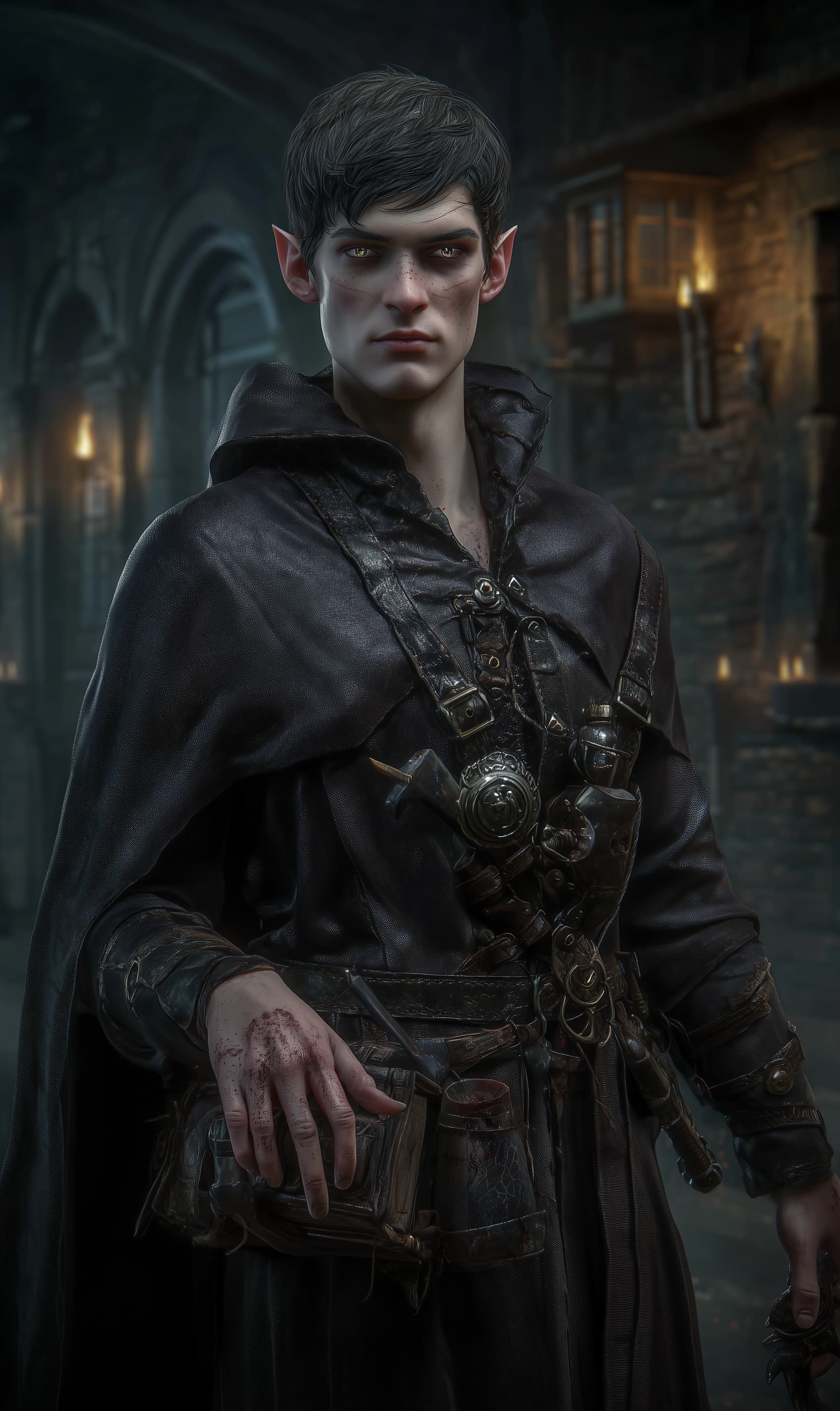 His hair is dark and kept short, his half-elven features deliberately understated. He wears layered gloves that can be shed quickly and carries a small bandolier of stoppered vials hidden beneath his cloak. Nothing about him looks dangerous until it already is.