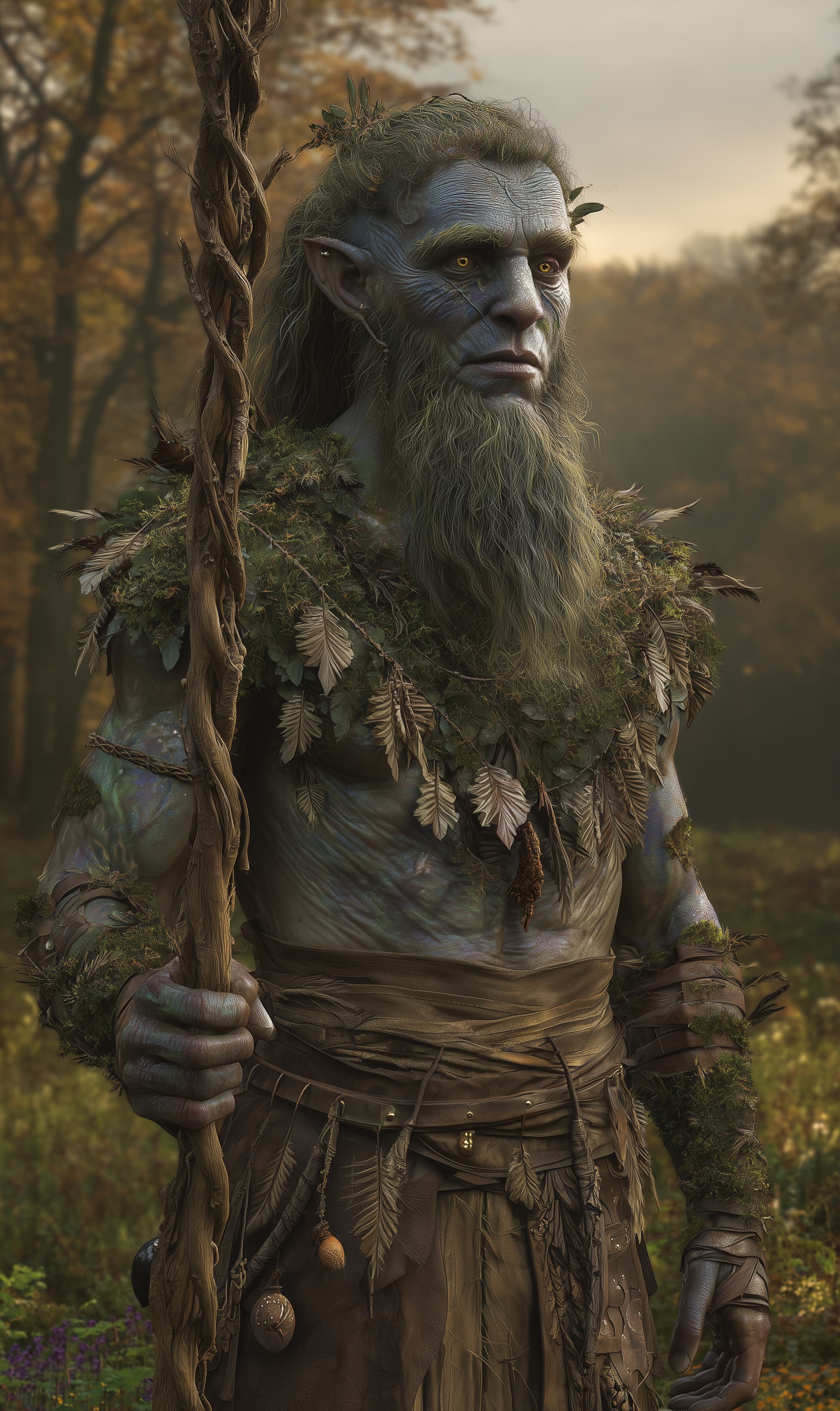 Appearance: Rowan Broadbough is a gentle giant, standing well over seven feet tall with a broad, barrel-chested frame softened by a lifetime of patient walking rather than war-marching. His skin is the muted blue-gray of shadowed bark, weathered and lined at the corners of his eyes from squinting into sunlit glades. Mossy-green hair, shot through with strands of silver, is pulled back into a loose, low knot, with strips of bark and feathers braided in. His beard is short and leaf-sprinkled, often bearing a few stray bits of lichen or fern that he hasn’t noticed.