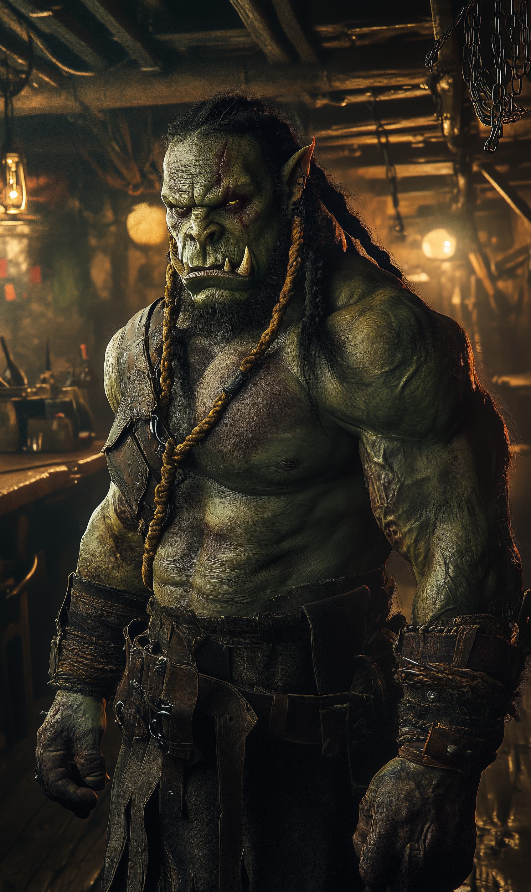 Appearance: Ruzkan is tall and broad, with a dense frame built from years at sea and a life skirting the edge of law and legend. His moss-green skin is streaked with old scars, and a thick hempen cord is tied loosely around his neck—a symbolic noose he never removes. His left eye is cloudy, his tusks chipped, and his braided hair hangs in uneven cords, some burned short. Despite his intimidating presence, his voice is low and thoughtful, and he moves with the patient economy of a man who has cheated fate.