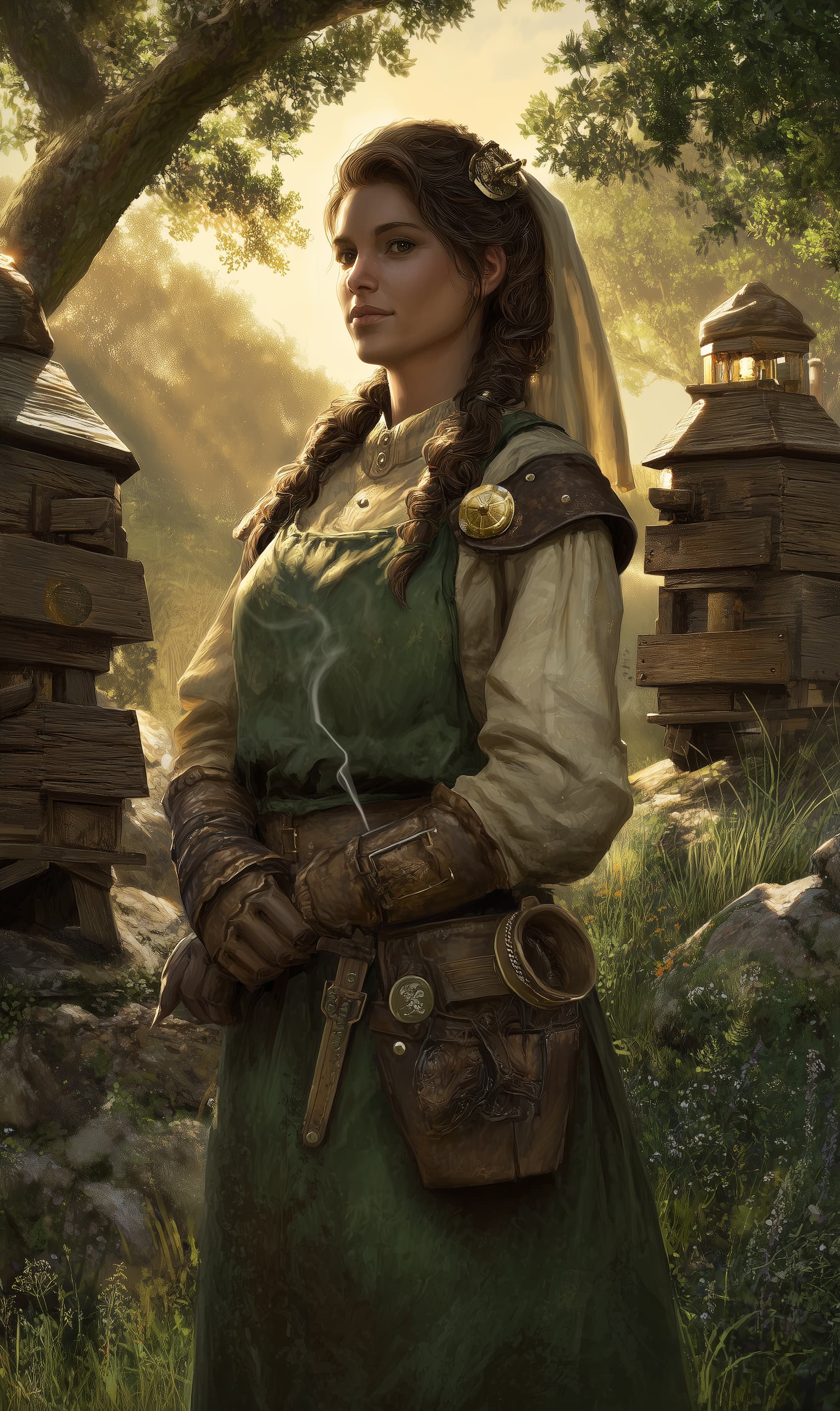 Raised among orchardists at the edge of Verdant Weald, Sable Nettle apprenticed under a hermit-beekeeper who swore the dusk-bees “sing the same notes the roots do.” When blight took the orchards one year, she split her hives and walked at twilight, coaxing the bees to new forage with a low, breathy hum learned from her mentor. The bees took, the blight eased, and neighbors began calling her Honey Warden. She distills a cordial called Afterlight—a steadying honey liqueur—and keeps queen lines pure, though lately someone has been stealing queens and leaving eerie wax faces in the empty frames.