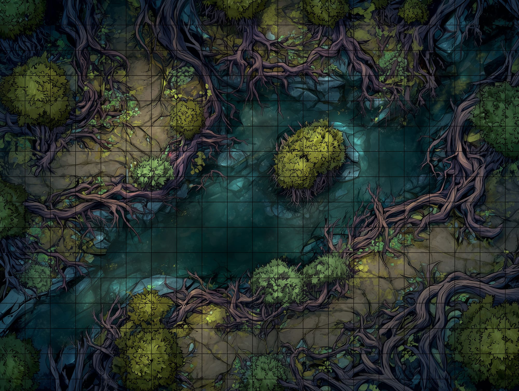 This map is perfect for encounters where terrain enforces discipline—rites of passage, guarded approaches to a sacred grove, ambushes by marshwardens, or battles against creatures that treat the rootways like home turf. The narrow path compresses the party into a vulnerable file, while the surrounding water discourages flanking unless someone can swim, fly, or balance confidently. It’s an excellent stage for melee pressure, forced movement, and “hold the line” tactics where positioning is earned inch by inch.