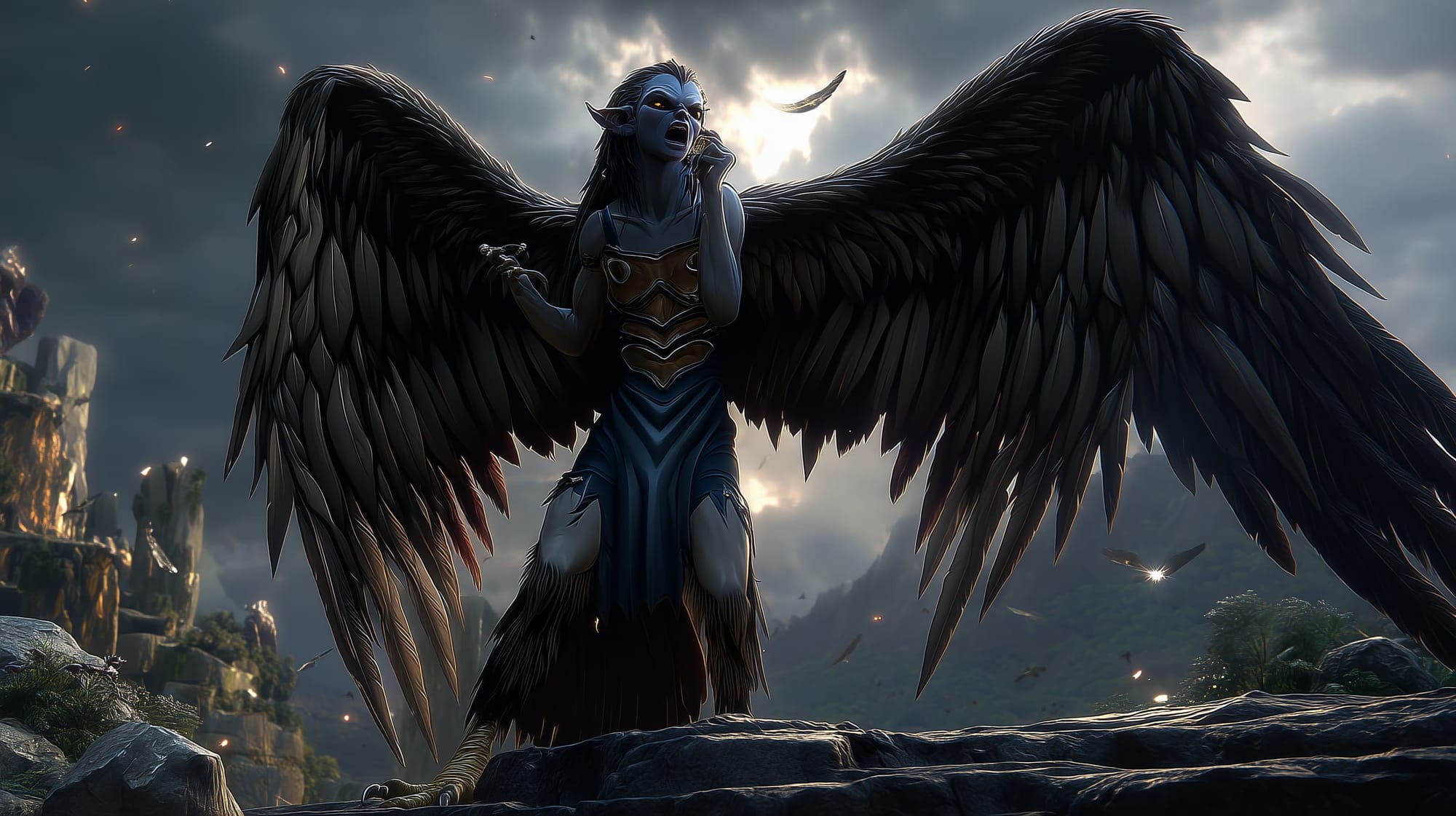 Among harpies, Saelith is both feared and sought out. Her voice is said to carry farther and linger longer than others, capable of reshaping melodies into personal laments that mirror the listener’s regrets. Lesser harpies sometimes follow her at a distance, feeding on those she ensnares but never daring to interrupt her rituals.