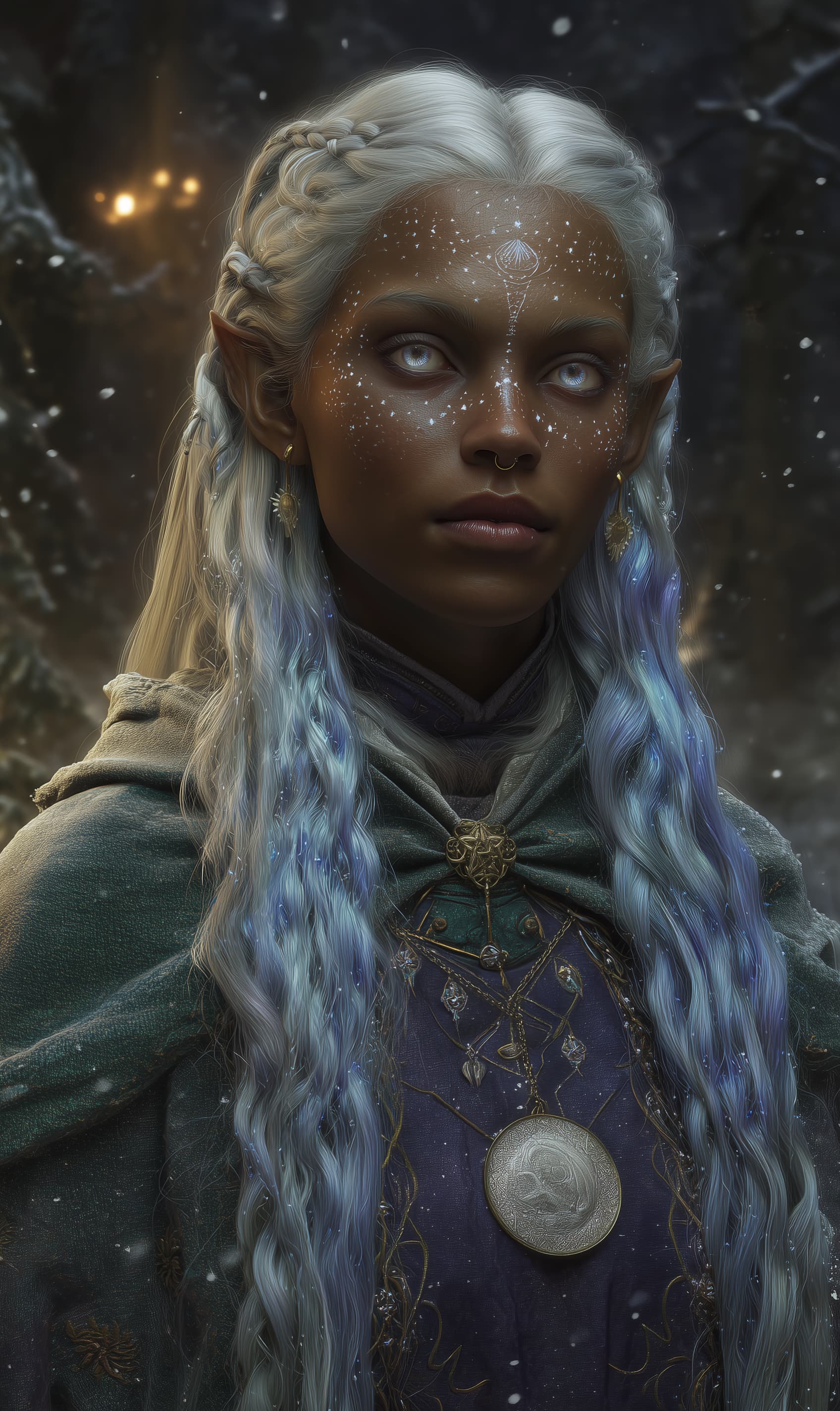 Appearance: Selenya Moondrift has the air of someone who never quite left the edge of a dream. Tall and willowy even for a wood elf, she moves with slow, deliberate grace, as if every gesture should disturb the night as little as possible. Her skin is a soft bark-brown, dotted with pale, freckle-like star marks across her cheeks, shoulders, and forearms. Long silver-white hair, threaded with faint blue strands, spills down her back in loose braids decorated with tiny polished stones and slivers of mirror. Her eyes are a luminous gray, like starlight reflected in still water; in dim light, faint points of silver seem to flicker in her pupils when she focuses.