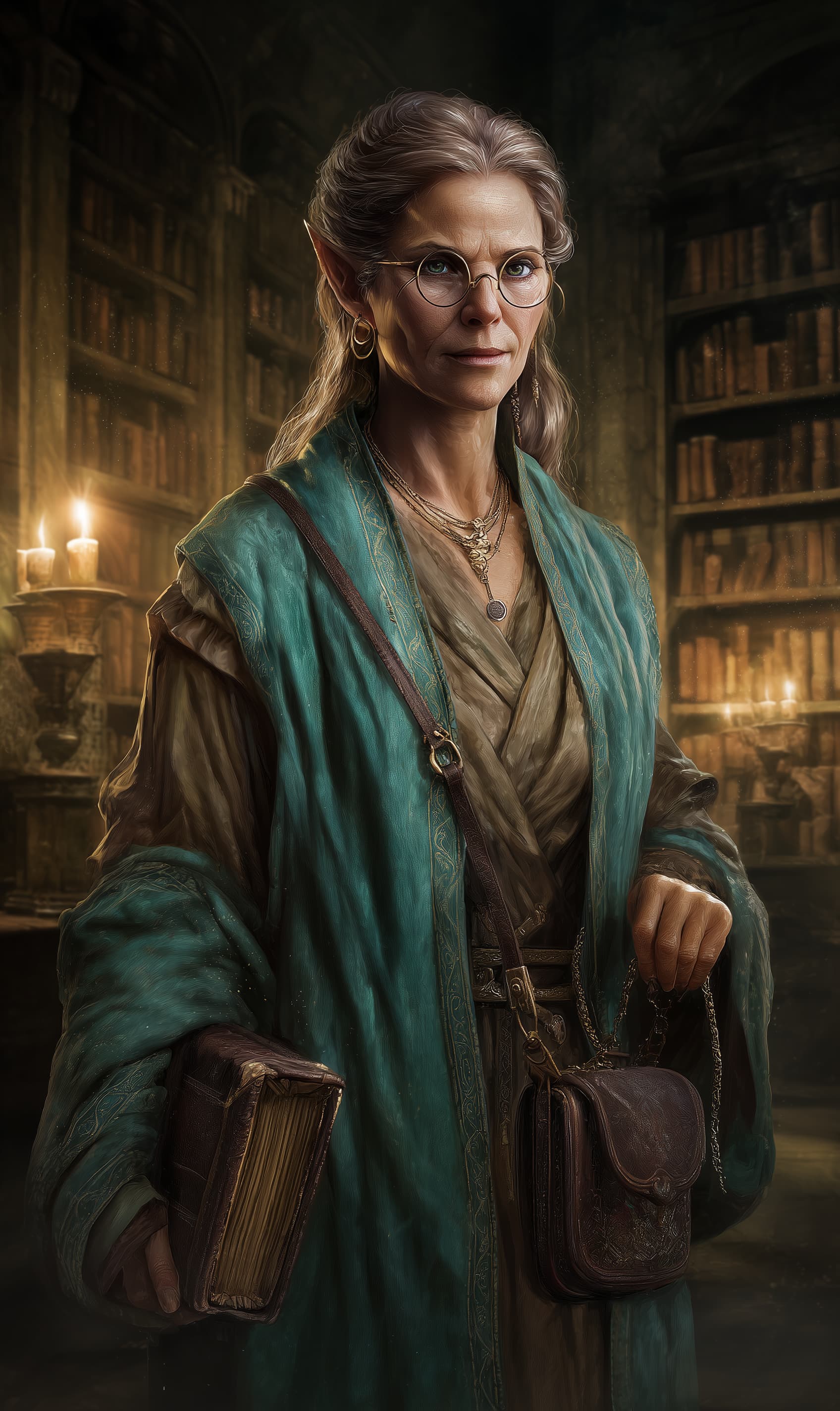 Appearance: Seraphine Daultry is in her early sixties, though her half-elven heritage keeps her looking a steady decade younger β fine-boned, sharp-eyed, with silver-streaked auburn hair almost always escaping from a loosely pinned coil. Ink stains are a permanent feature of her right hand from the first knuckle to the wrist, and her reading spectacles β round-lensed, brass-framed β are pushed up onto her forehead more often than they cover her eyes. She favors practical scholar's robes in muted teal and warm brown, layered for the perpetual chill of the archive vaults, with a leather satchel worn cross-body that is always overfull and always organized in a system only she understands. A small silver key on a neck-chain unlocks the archive's most restricted cabinet, and she rests a hand on it unconsciously when she's worried.