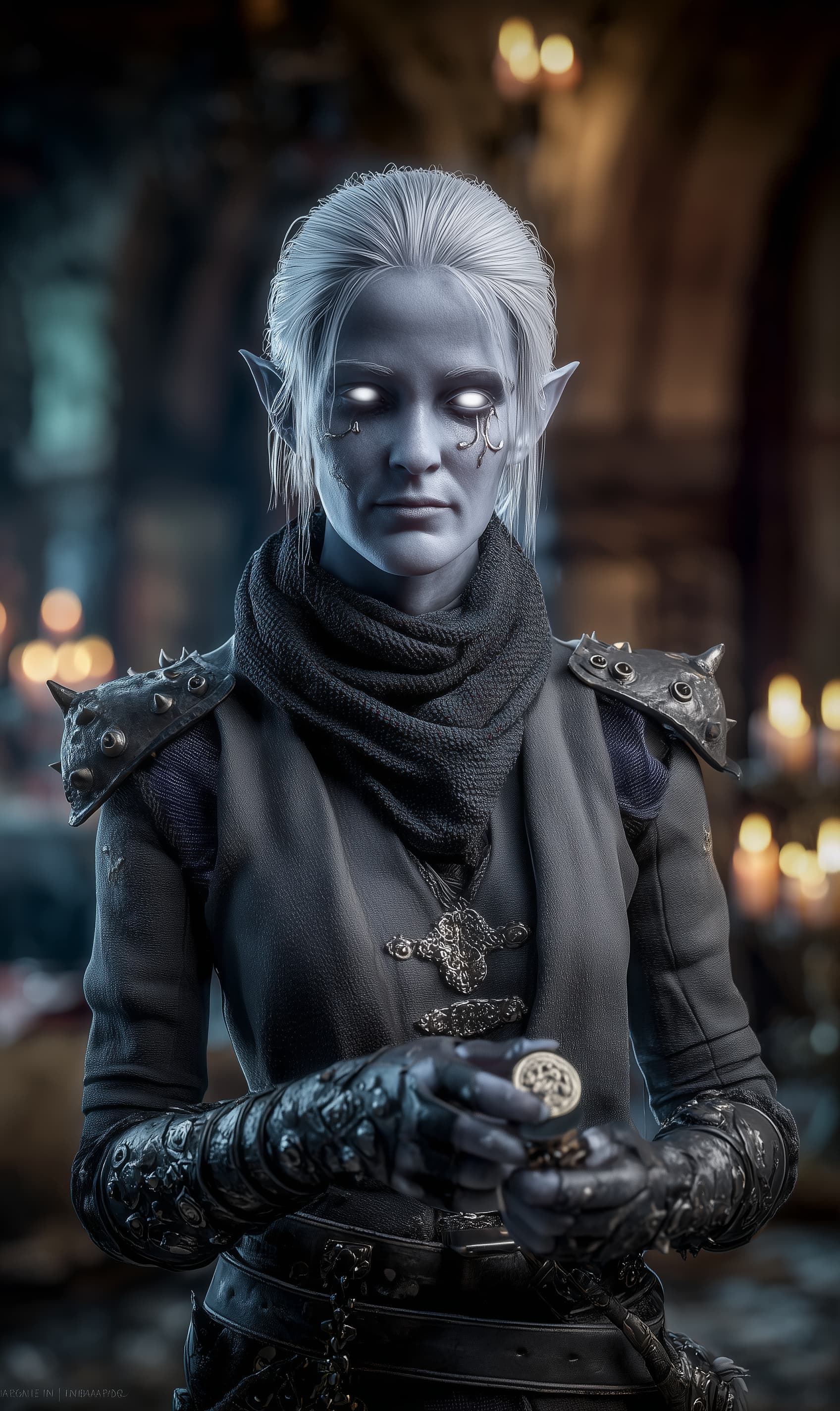 Appearance: In her unmasked form, Sevi is willowy with pearl-gray skin that seems to take on nearby hues, pupil-less opal eyes, and white-silver hair worn in a low knot. Fine “seam lines” trace her cheekbones and jaw—a tell when she’s tired. She dresses for anonymity: charcoal winter coat over padded leathers, fingerless ink-stained gloves, a scarf that can hide the lower face, and soft boots that don’t squeak on wood. At her belt: a ring of pigeon-key tokens, a punch for wax seals, a slim stiletto, and a lacquered whisper-coin. When working the booths she favors a dozen “faces”—dock clerk, courier, auntie, scribe—each with its own voice and gait.