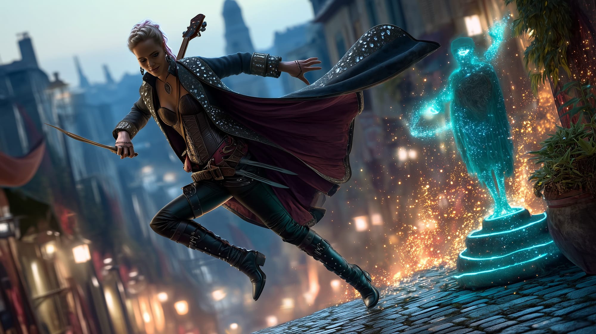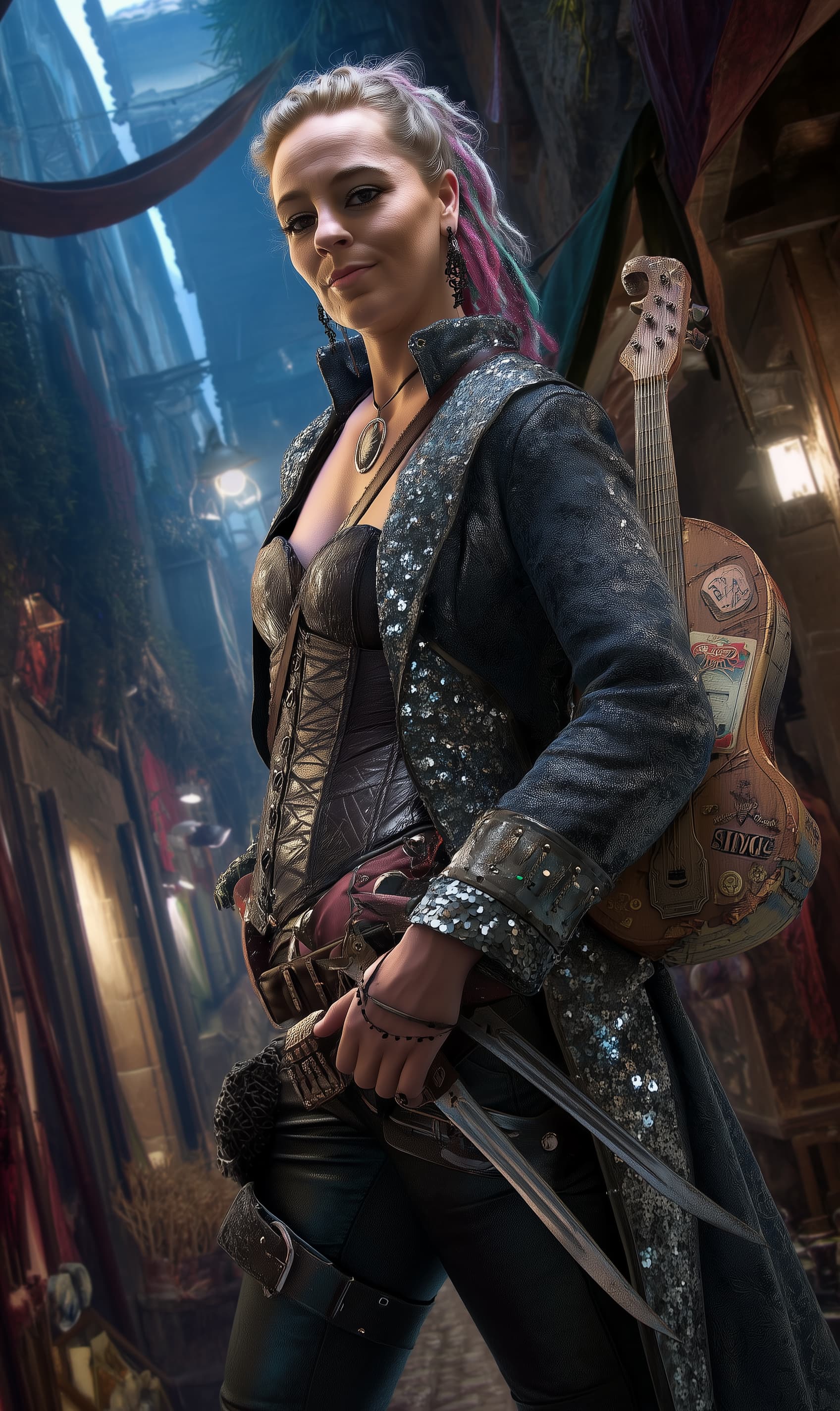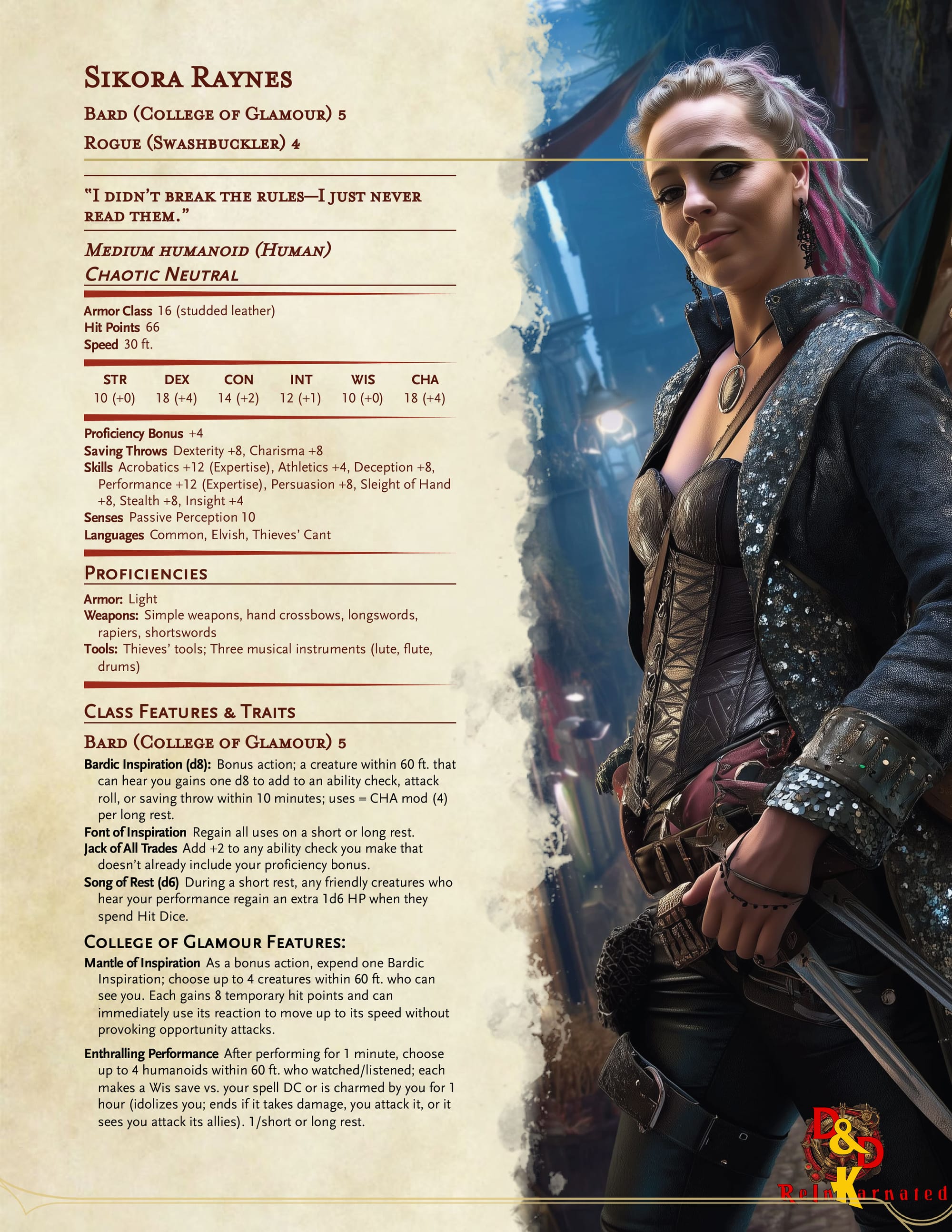 Appearance: Sikora Raynes is a riot of color and charisma. Her outfit is a mash-up of military-style tailoring, street flair, and stage-ready glam: a high-collared, asymmetrical jacket with glittered epaulets over a tight corset and leather trousers studded with metal scales. A short rapier rests at her hip, and twin throwing daggers are hidden in thigh holsters. Her hair is dyed in shifting streaks, and a rogueish grin is nearly ever-present. She wears mismatched earrings and has a crescent tattoo behind her left ear. At her back hangs a customized lute—covered in band stickers, arcane doodles, and carved initials.