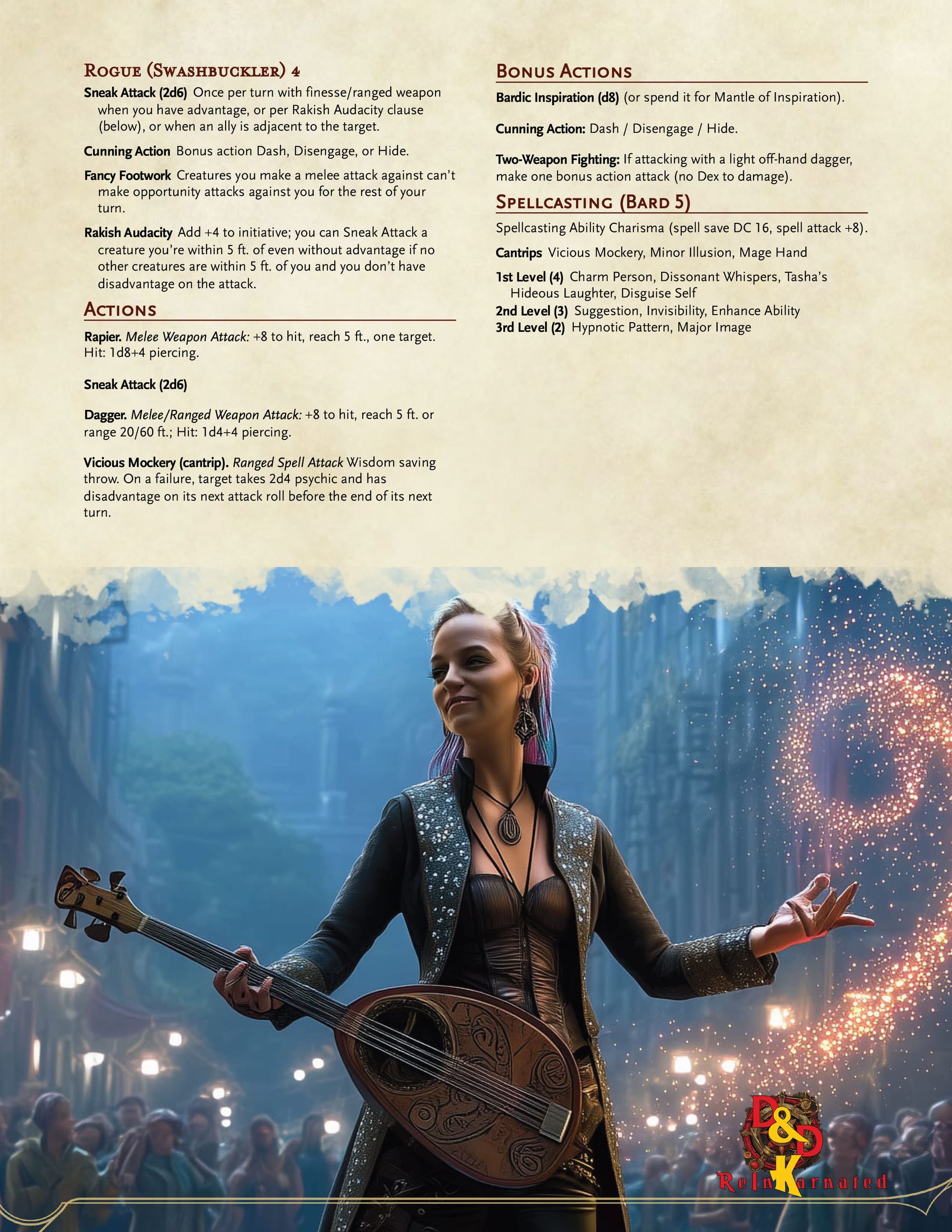 Class/Role: Bard (College of Glamour) 5 / Rogue (Swashbuckler) 4