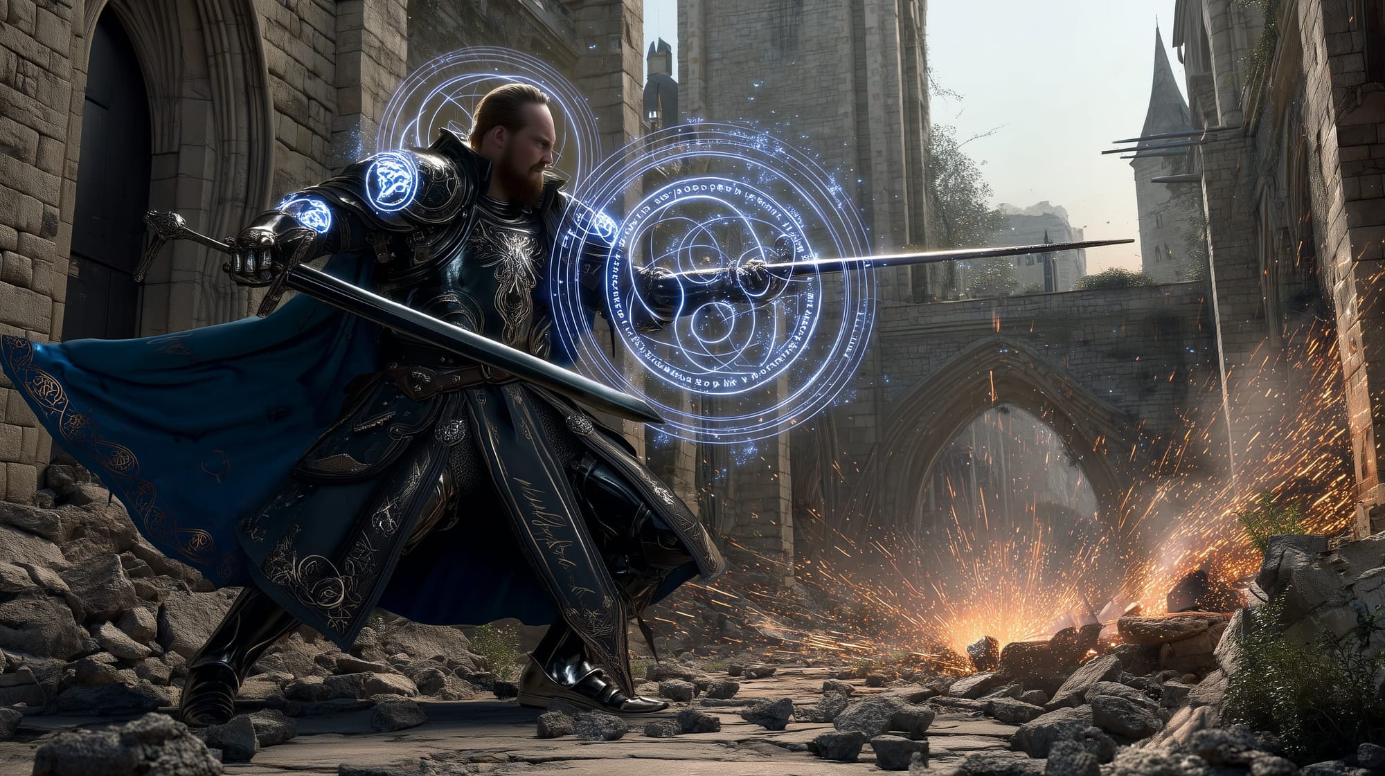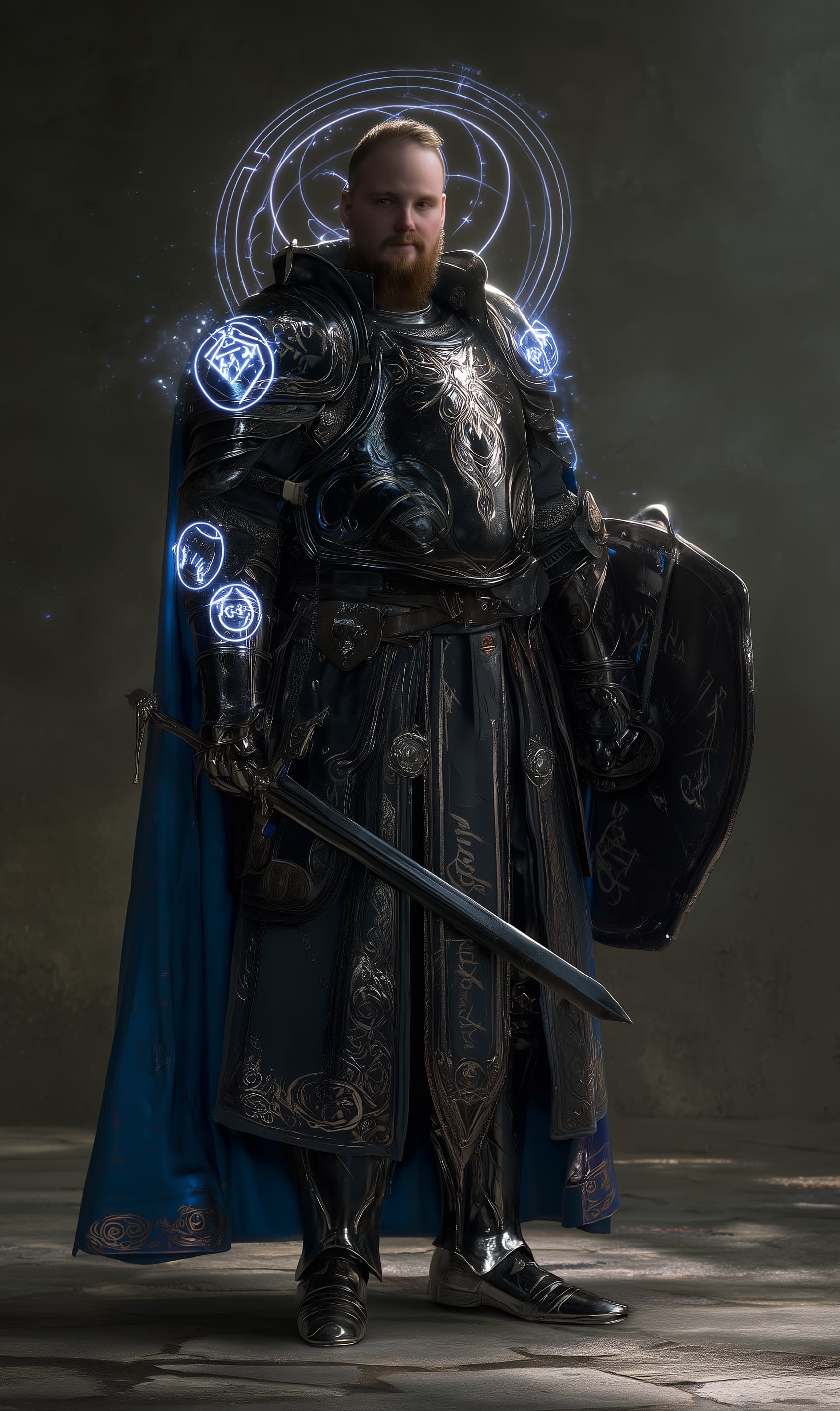 Appearance: Sir Patrek Halvar wears plate armor meticulously inscribed with faint, glowing sigils that pulse when he casts magic. His armor is a masterwork blend of steel and arcane binding runes, matte black with cobalt trim, featuring a regal shoulder mantle and a reinforced left pauldron etched with his house crest—an arcane sword point-down over a crossed scroll and shield. A longsword rests at his hip, enchanted and clean, and a tower kite shield is strapped across his back. His cloak is heavy, royal blue with silver threading, and his movements are measured, deliberate, and ready.