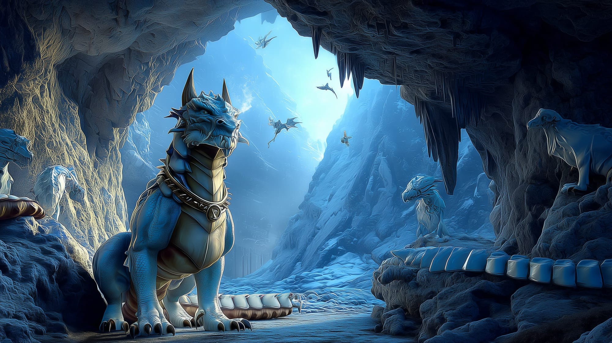 Bred as a living alarm and enforcer, Skarth leads Irdryth’s kennel packs through the Hunger Dome’s blue galleries. White guard drakes like him are the tyrant’s ground game—they run tribute routes, test thin ice, and pin trespassers until mephits or ogres arrive. Berserkers call him the First Collar; he decides who eats the warmest meat. To the dragon, Skarth is a perfect tool: tireless, brutal, and loyal to scent and sound—the iron tang of chains, the click of a handler’s whistle, the cold musk of her hoard.