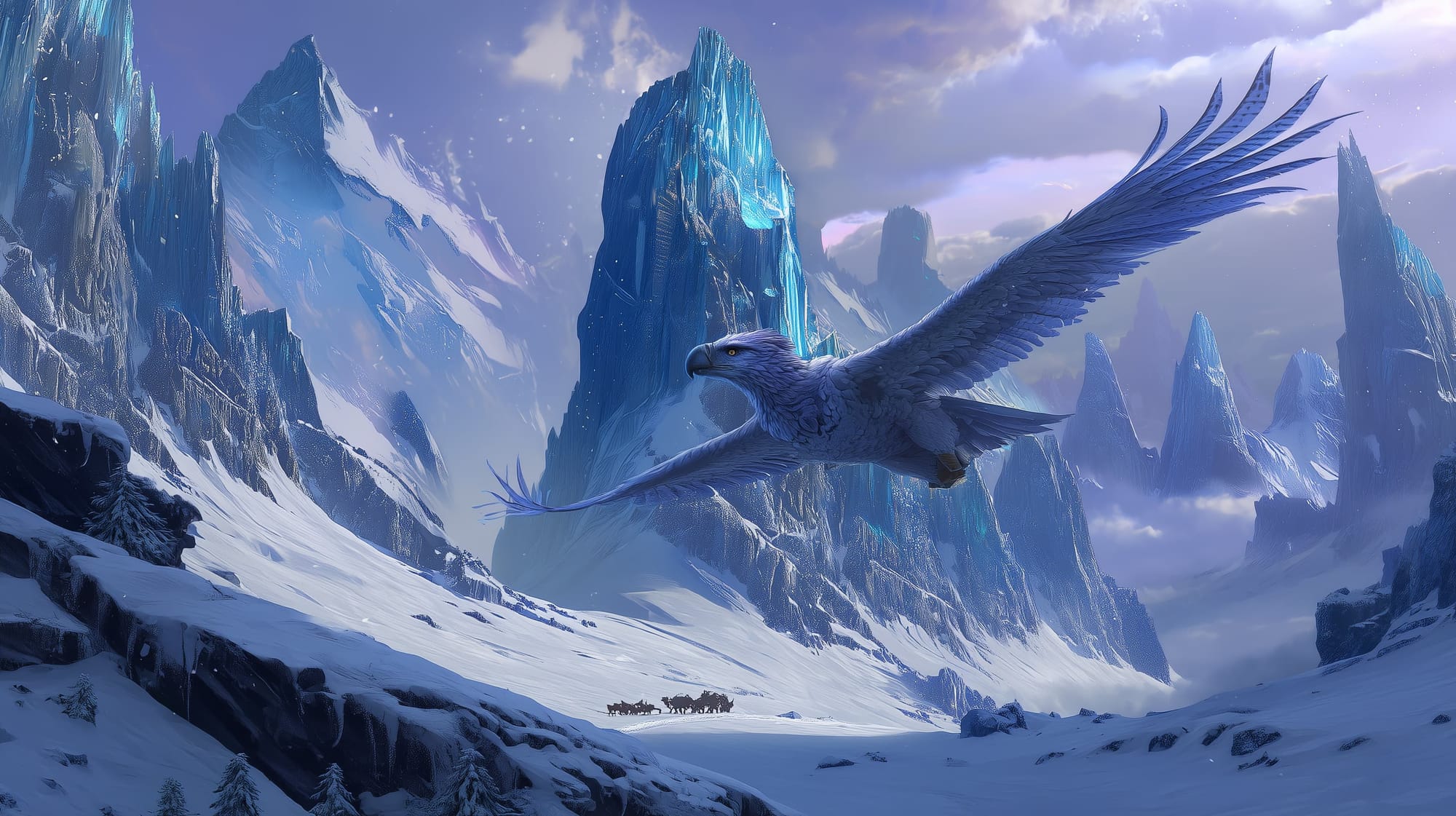 A cathedral of pinions: slaty backfeathers grading to winter-white primaries, each rimed in hoarfrost. Her talons are yellow ice scythes; the hooked beak is black basalt. One primary bears a bronze cap—the remnant of a dwarven skyhunter’s tracking harness. Around her neck hangs a rag-snagged banner scrap, wind-hissed to threads. Close up, her eyes are stormglass: pale, reflective, pitiless.