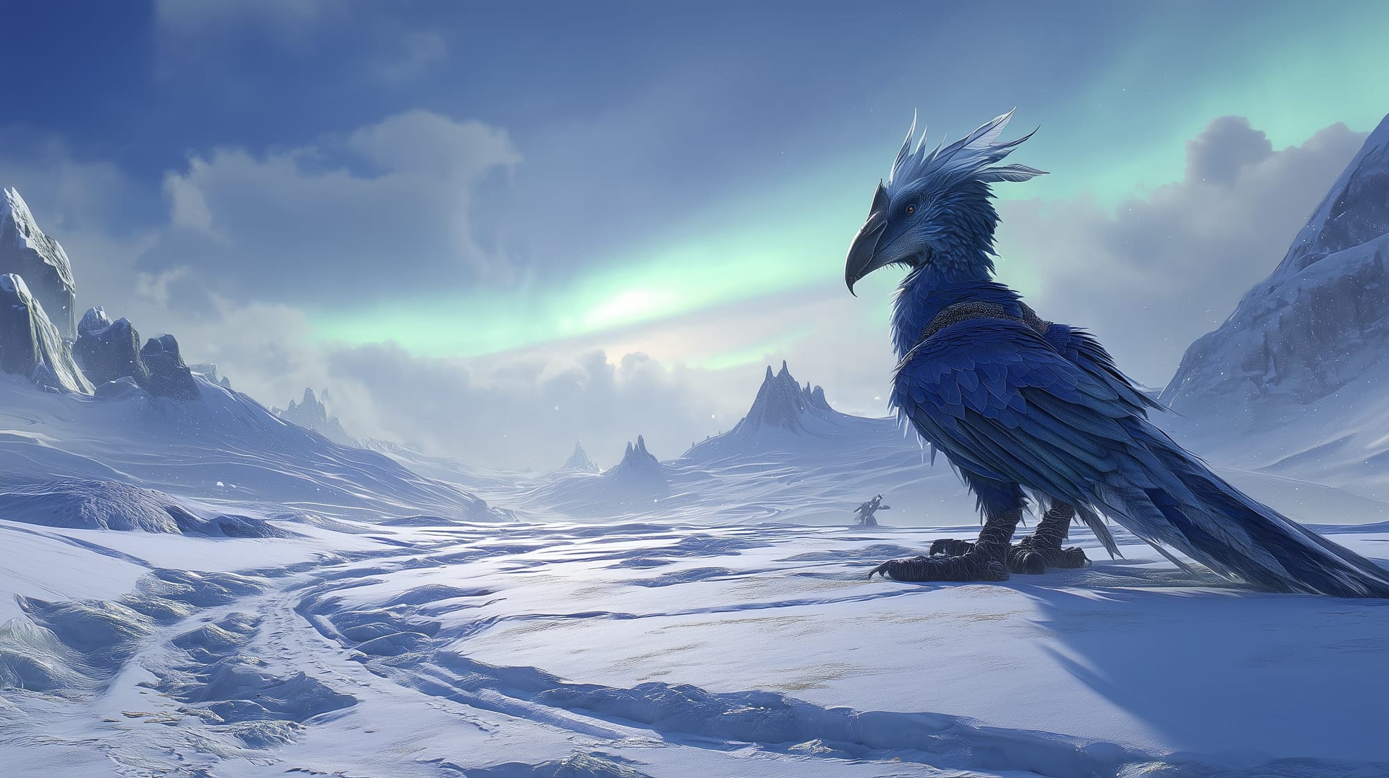 Sleetspur leads a loose-running string of axe beaks that haunt the windward flats where crusted snow carries their weight but not yours. They are opportunists and scavengers as much as hunters—shadowing mammoth herds, wolf packs, and caravans for dropped meat, then turning into stampeding lances when hunger bites. Raiders try to break them as mounts each winter; some succeed for a season before being outpaced, outkicked, or outsmarted. To tundra folk, Sleetspur is a weather sign: when her string runs early, the crust will hold; when she lingers near drifts, storms are coming.