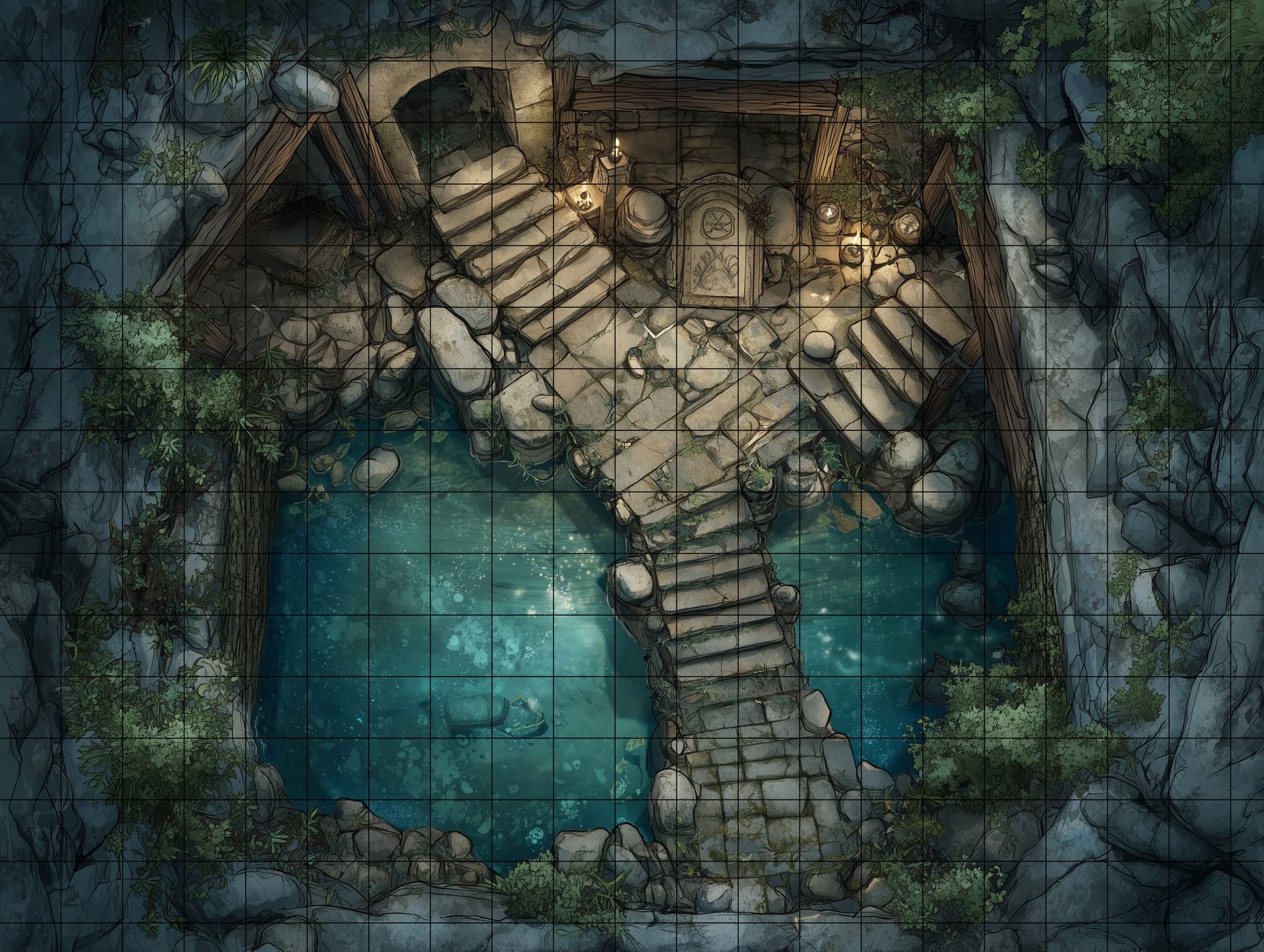 This map is ideal for a dungeon-like encounter that blends exploration tension with sudden violence. The layered steps and terraces naturally split the fight into vertical zones—combatants on higher landings can control approaches, while anyone forced into the flooded basin becomes slower, louder, and more vulnerable. It’s perfect for tomb guardians, rival delvers, cultists attempting to break a seal, or undead stirred by disruption. The environment invites tactical choices: hold the stairs, push enemies into water, or risk flanking through cracked side gaps.