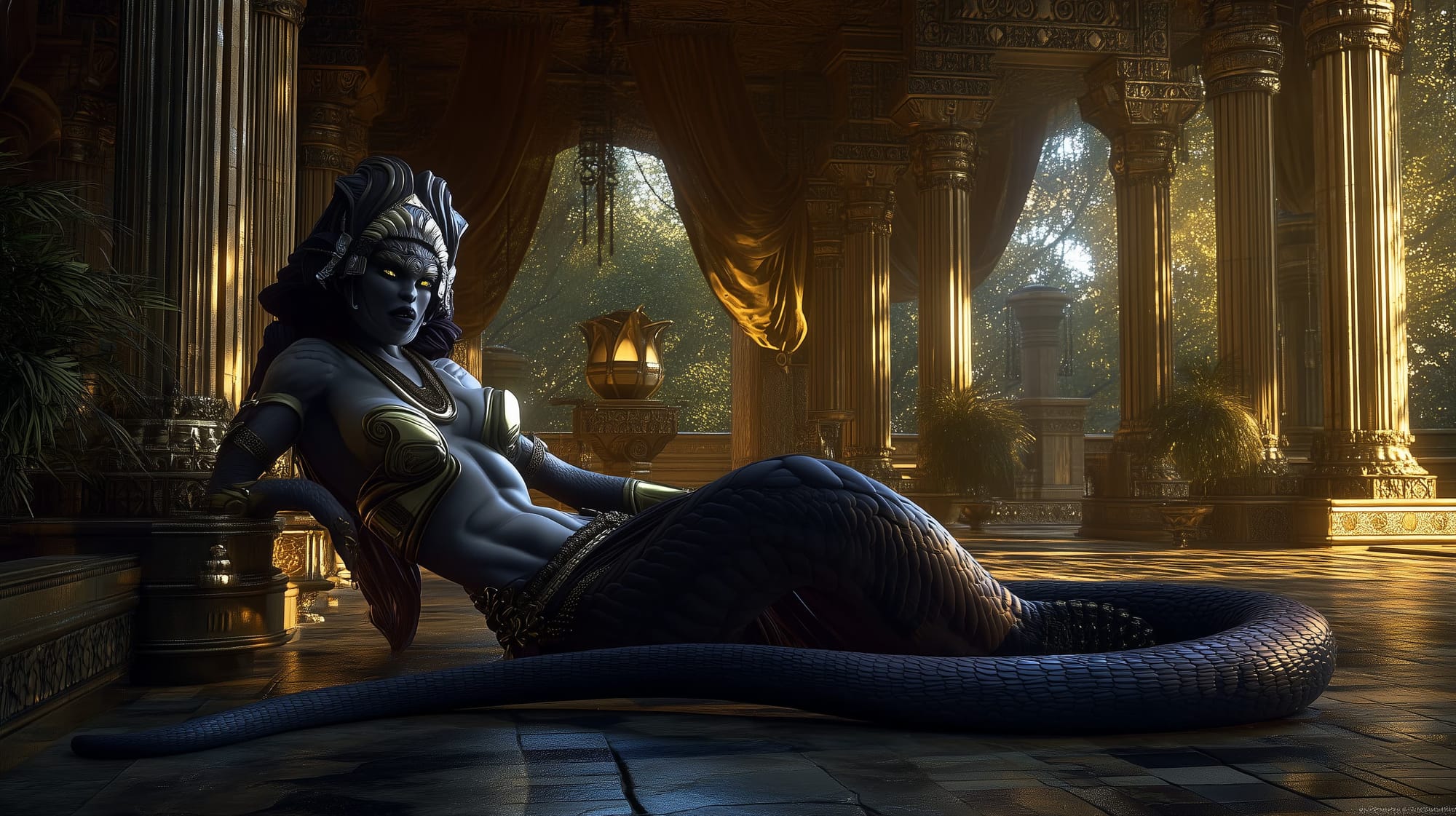 She adorns herself with layered jewelry—gilded collars, arm rings, and chains that drape along her coils like offerings rather than restraints. When she moves, there is no haste—only inevitability.