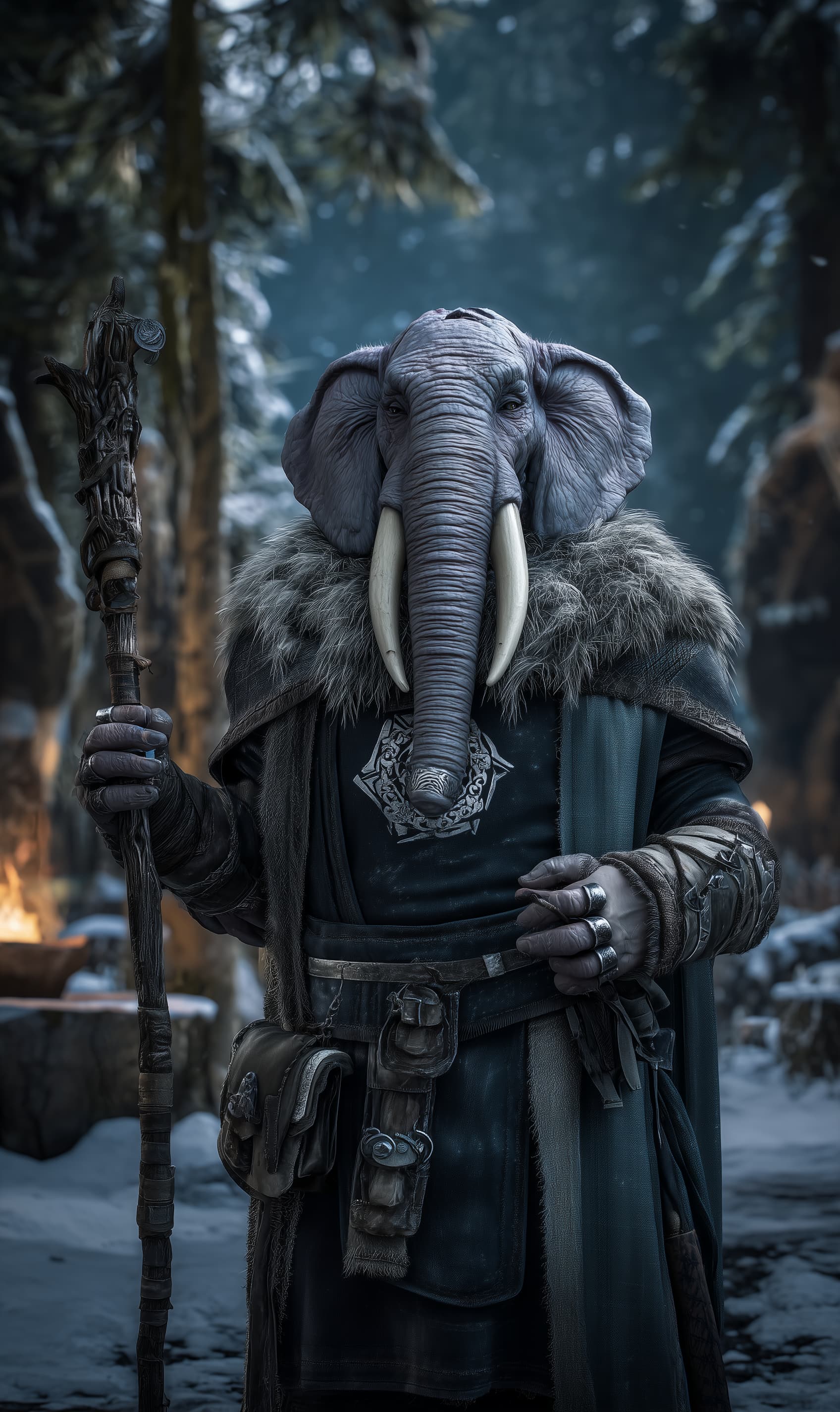 Appearance: A towering, soft-eyed loxodon with slate-gray, weather-lined skin and a calm, deliberate grace. Talgyr’s trunk bears silver thread-rings near the tip for delicate work; modest ivory tusks often capped in engraved brass. He wears layered winter blacks beneath a thick, wool-lined shawl clasped with a snowflake-and-knot medallion, and a long tabard stitched with names of the departed. A satchel holds incense cones, a tea brazier, and vellum memory tablets; an oaken staff doubles as a walking stick and gong beater. His breath huffs like a small bellows, and faint rosemary and cedar cling to his clothes.