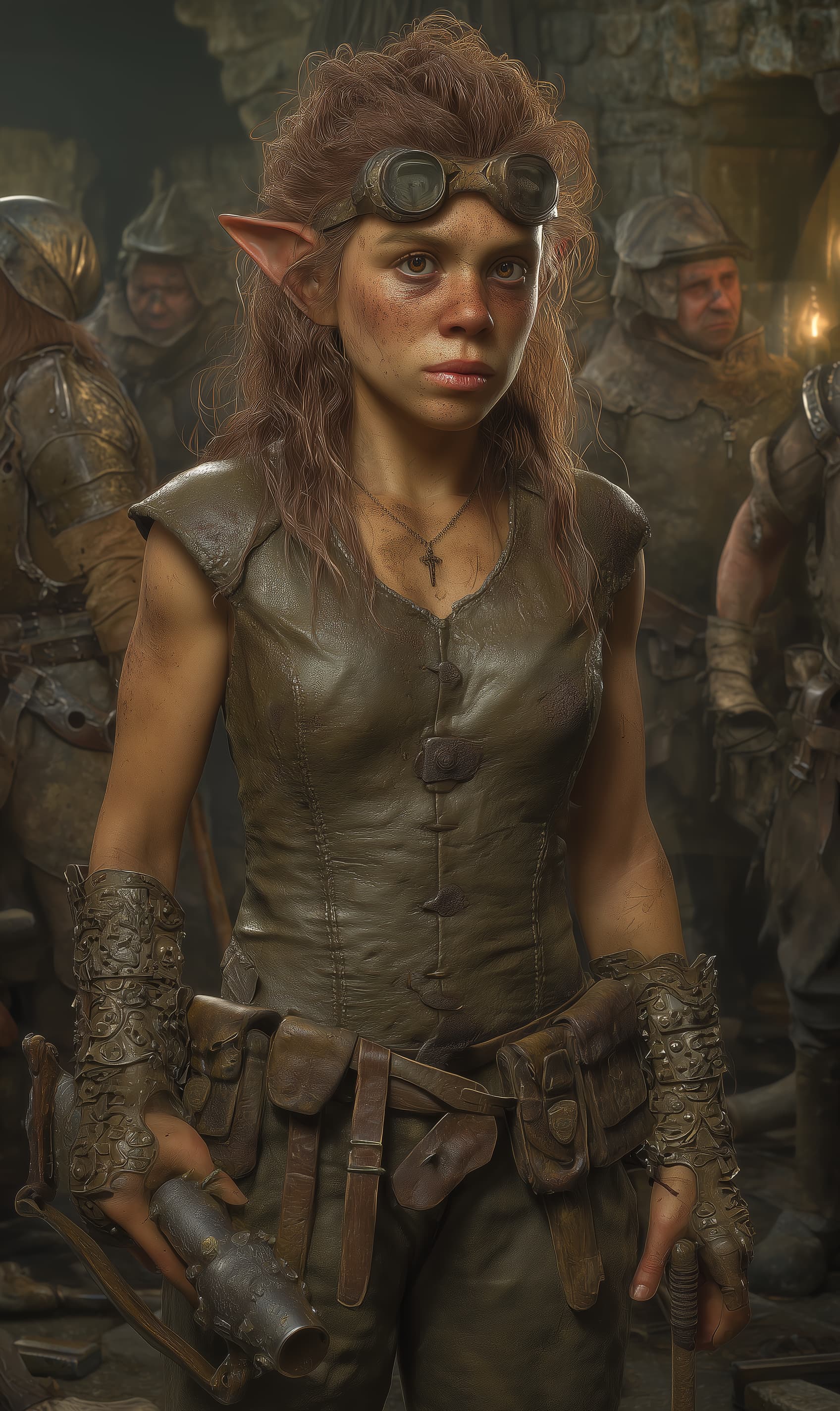 Appearance: Tamsi Coppercoil is a compact storm of motion in a soot-streaked package. Barely three and a half feet tall, she has a round, lively face framed by a wild halo of corkscrew auburn curls that escape any attempt at taming. Brass goggles with cracked but carefully repaired lenses sit on her forehead or over one eye, leaving pale rings around otherwise permanently smudged skin. Her eyes are bright copper-brown, always glittering with a mix of mischief and manic calculation.