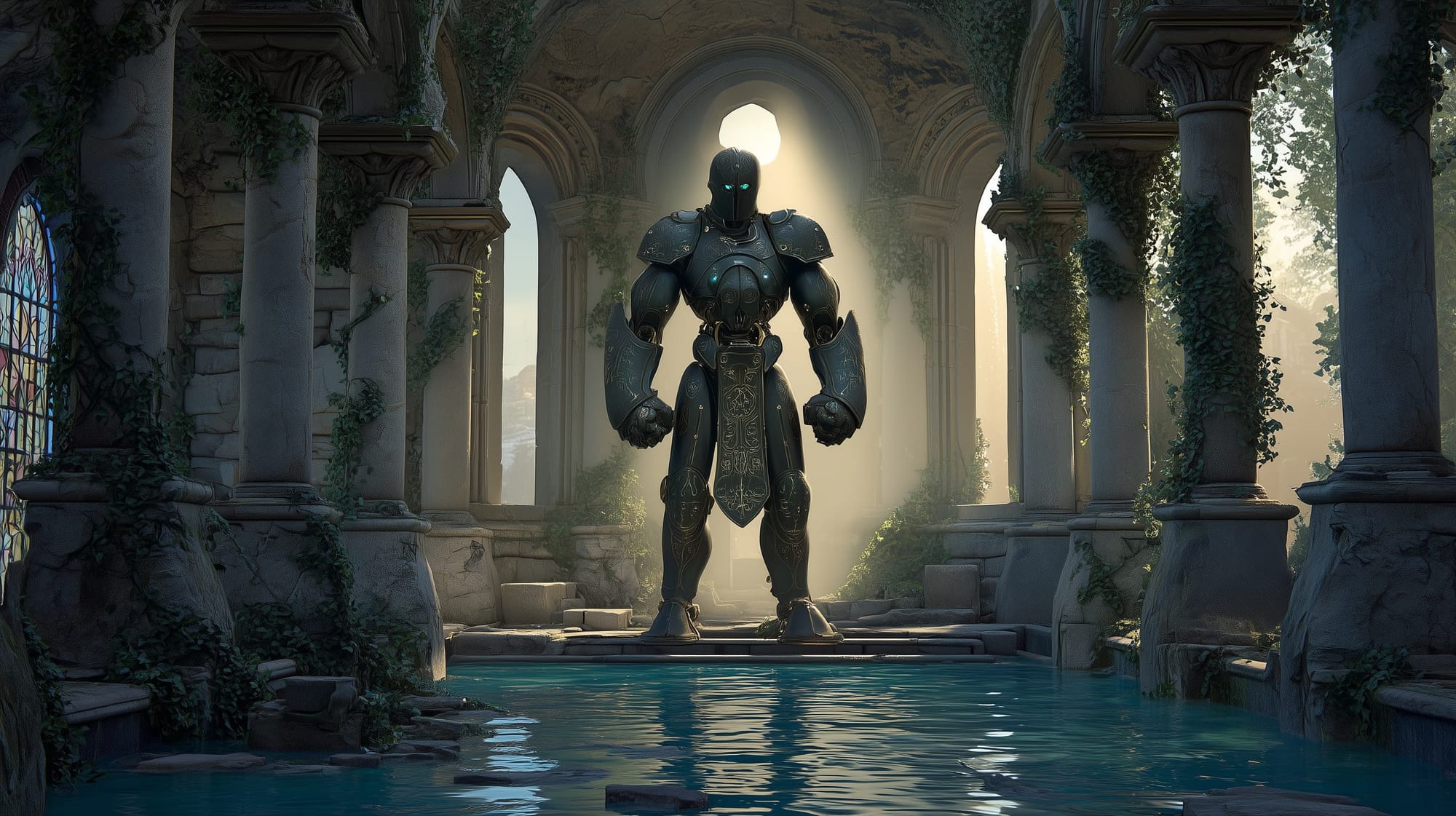 Towering at twelve feet tall, the Bastion is a masterwork of arcane engineering, its ornate plating etched with glowing sigils and war-scripts. Its eyes gleam like twin sapphires — not with life, but vigilance.