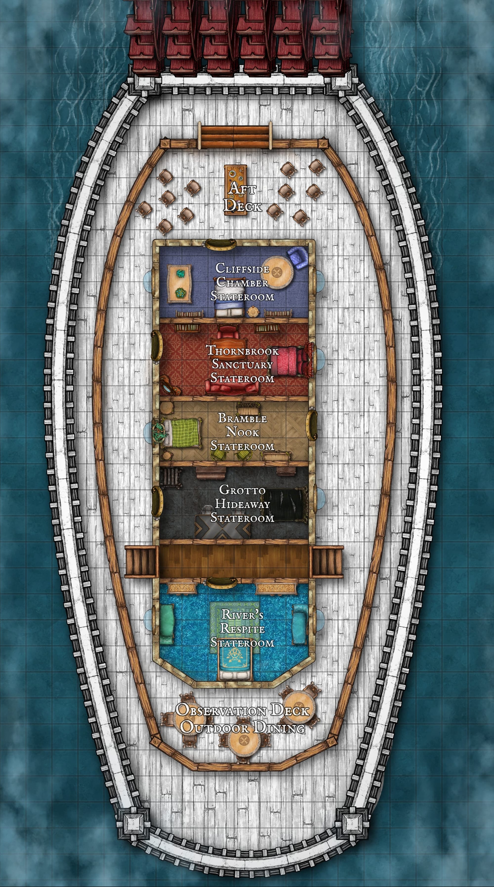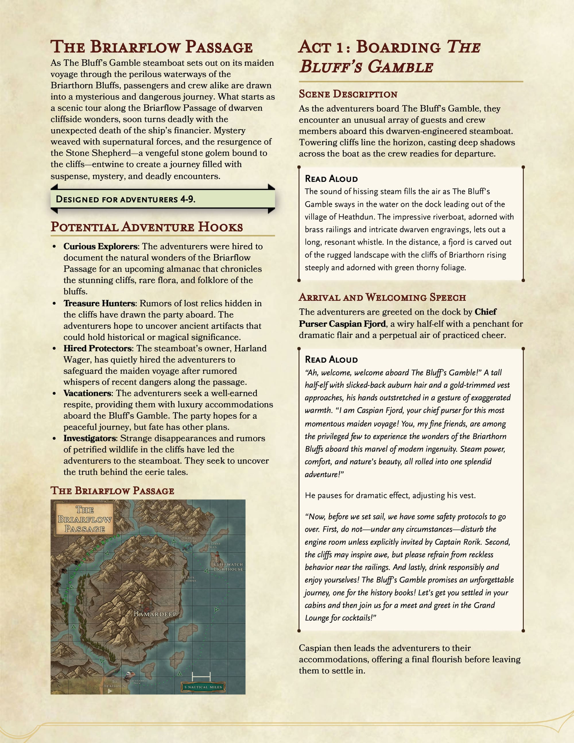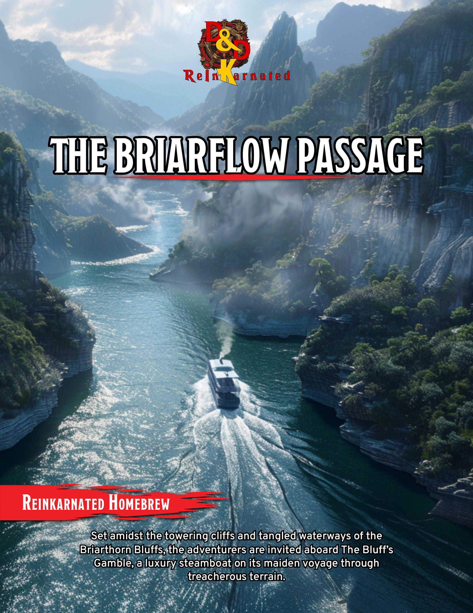 Embark on a journey aboard The Bluff’s Gamble, a luxurious steamboat making its maiden voyage through the breathtaking Briarflow Passage. This adventure combines the intrigue of a murder mystery with the danger of ancient curses lurking in the rugged cliffs and waterways of the Briarthorn Bluffs.