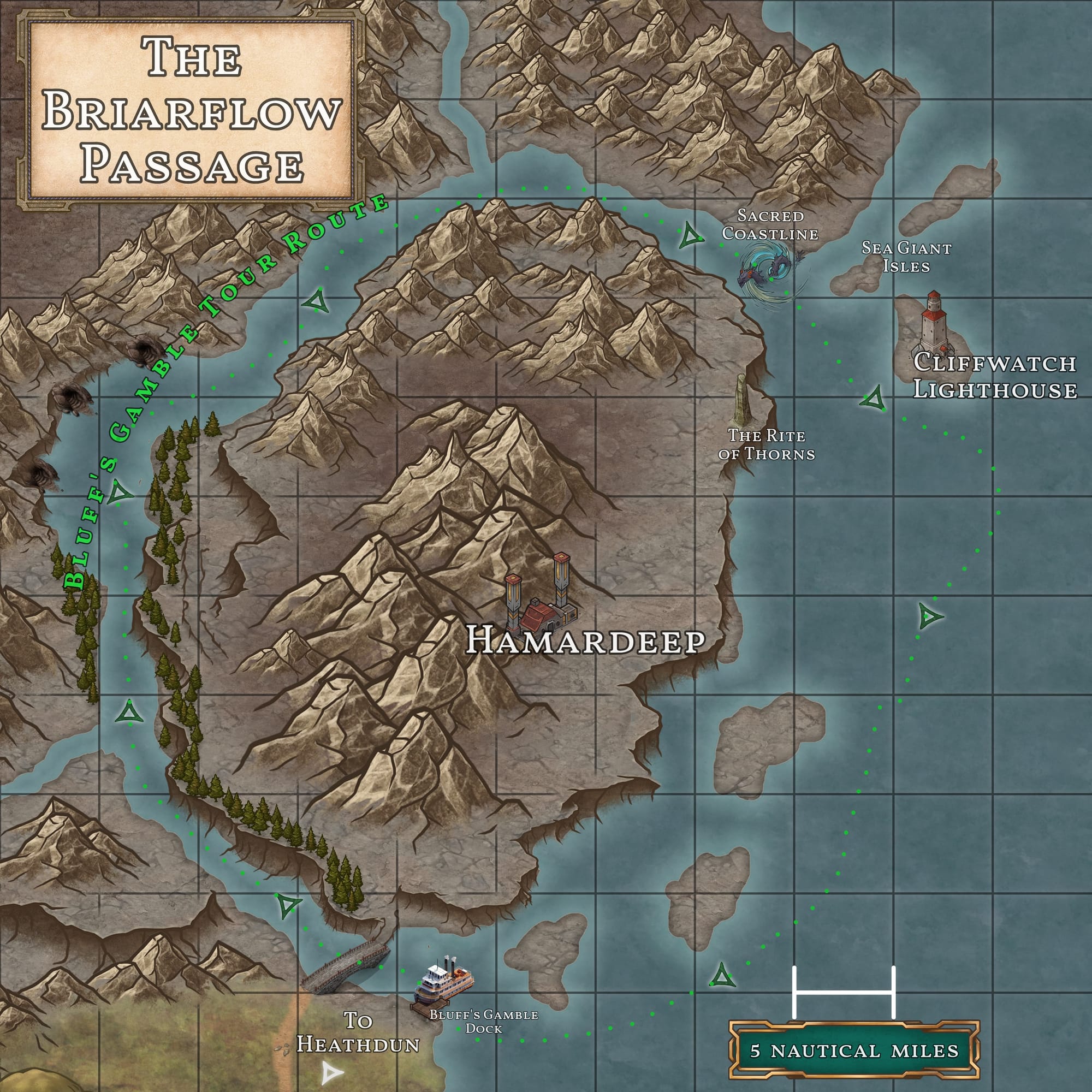 Board The Bluff’s Gamble for a voyage through the awe-inspiring Briarflow Passage, where natural beauty masks ancient forces waiting to be uncovered. This adventure blends exploration, suspense, and thrilling encounters with unique allies and fearsome foes. Gather your courage, sharpen your wits, and set out to leave your mark on the Briarthorn Bluffs. Will your party rise to the challenge, restoring balance to the cliffs and earning the trust of a forgotten people? The next chapter of your tale begins here—your story awaits.