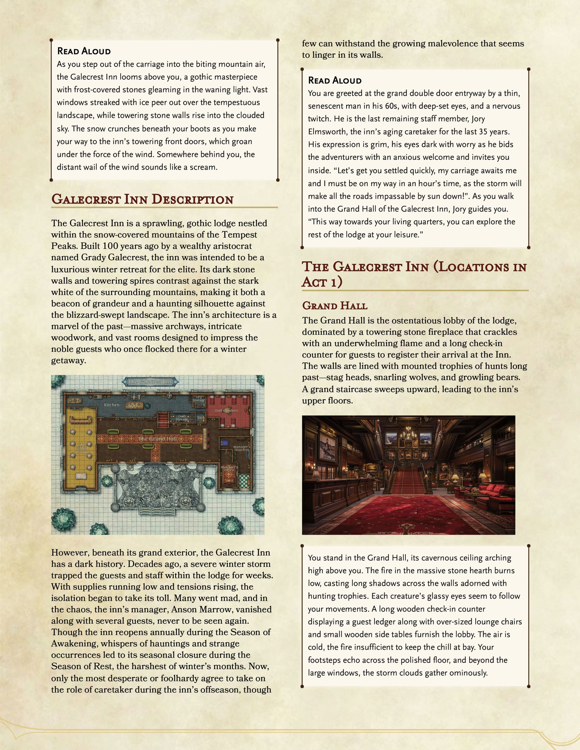 As an unrelenting blizzard traps them inside, the adventurers begin to experience haunting visions, hear whispers that twist their minds, and encounter ghostly figures like Torrence, the spectral bartender, and Winifred, the restless maid. They must unravel the dark past of Anson Marrow, the original manager who disappeared decades ago, and confront the malevolent force tethering the inn to its sinister fate. The exploration takes them through shifting hallways, rooms steeped in mystery, and an outdoor hedge maze where Anson's spirit awaits with deadly intent.